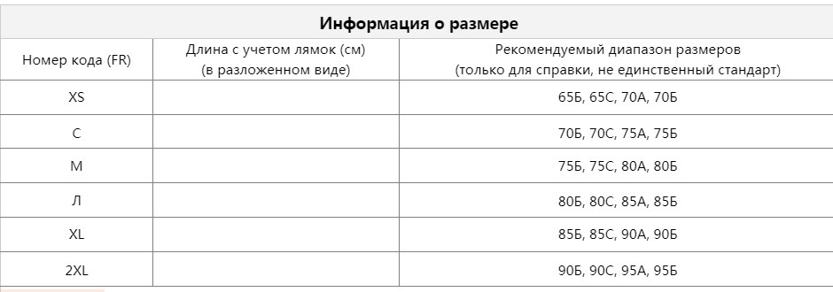 Размер: XS 65BCD70AB, S: 70BC75AB, L 80BC85AB, XL 85BC90AB