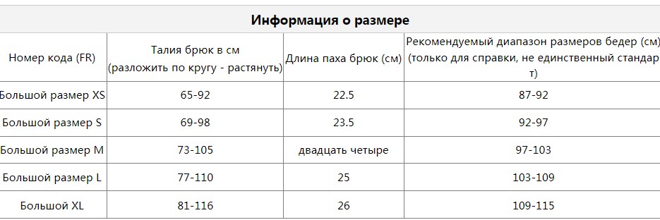 Размер: XS: окружность бедер 87-92 см., M: обхват бедер 97–103 см., L: 103–109 см., XL: обхват бедер 109–115 см.