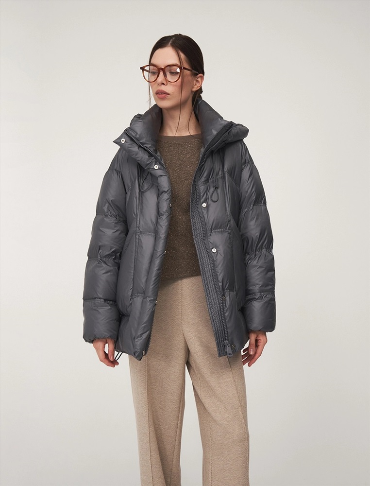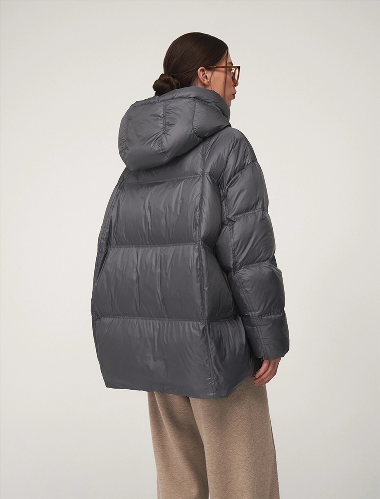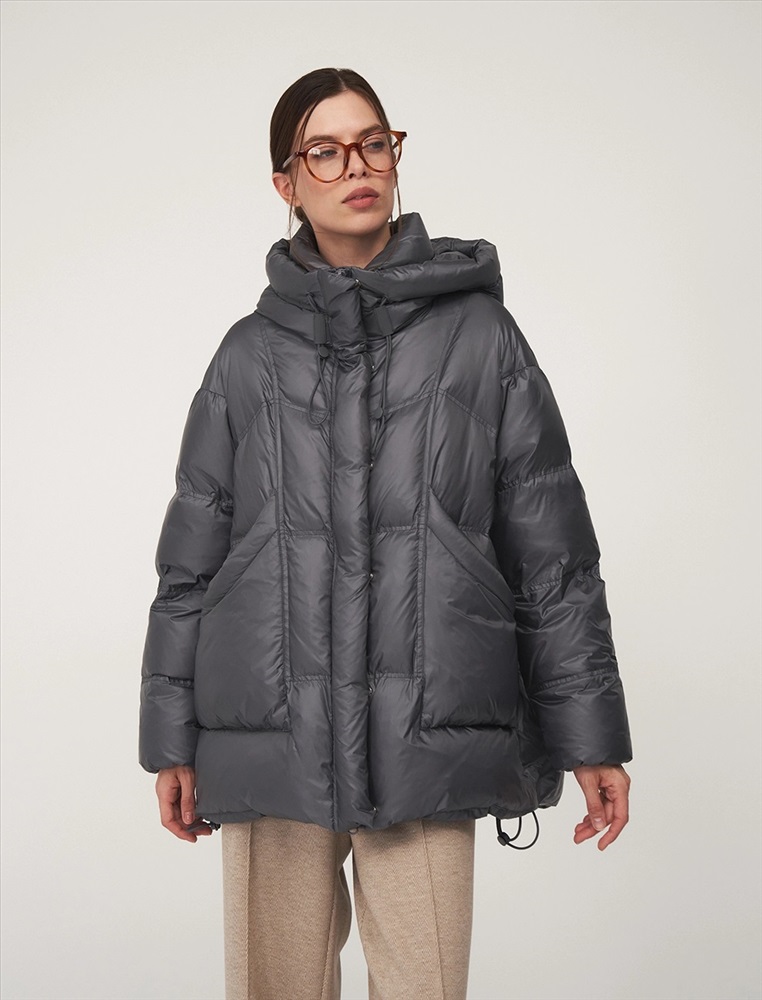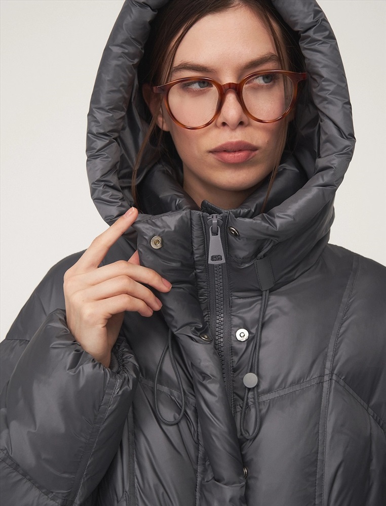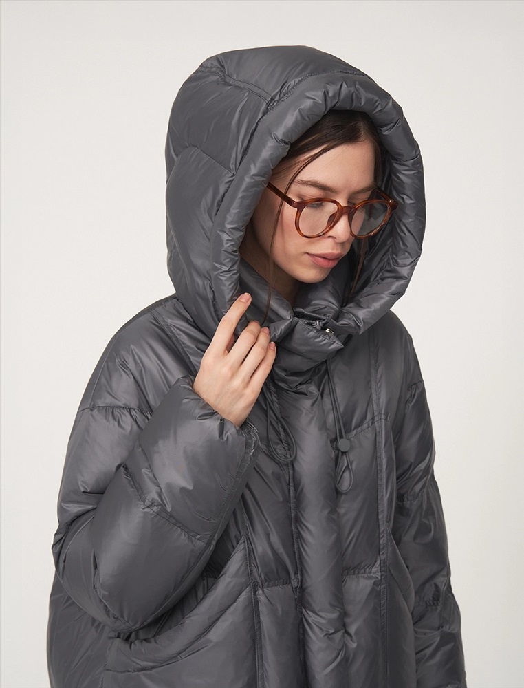 Пуховик А-образного силуэта, длиной до уровня ниже бедра и спущенной линией плеча. Высокий воротник и капюшон защищают от ветра. По передней части планка с застежкой на молнию с двумя пуллерами. По бокам накладные карманы. По низу и по воротнику затяжники с фиксаторами. В составе утеплителя утиный пух (90%) и утиное перо. Представлен в серо-голубом оттенке.