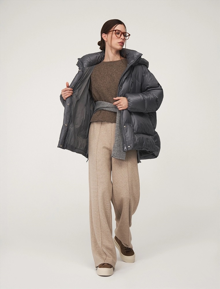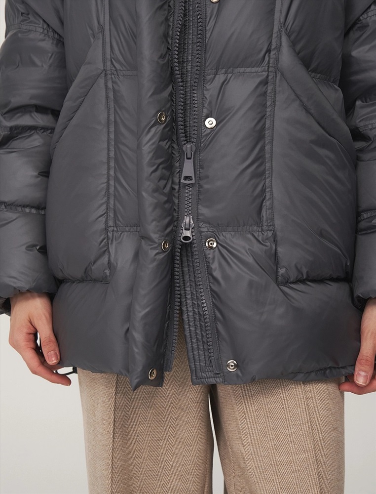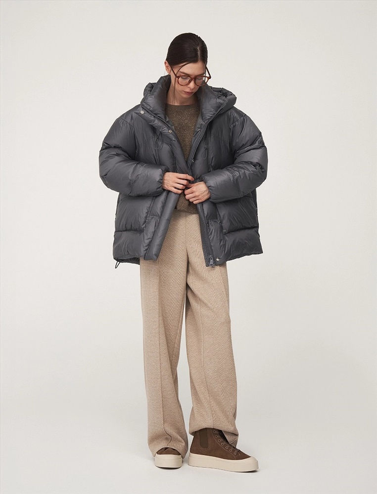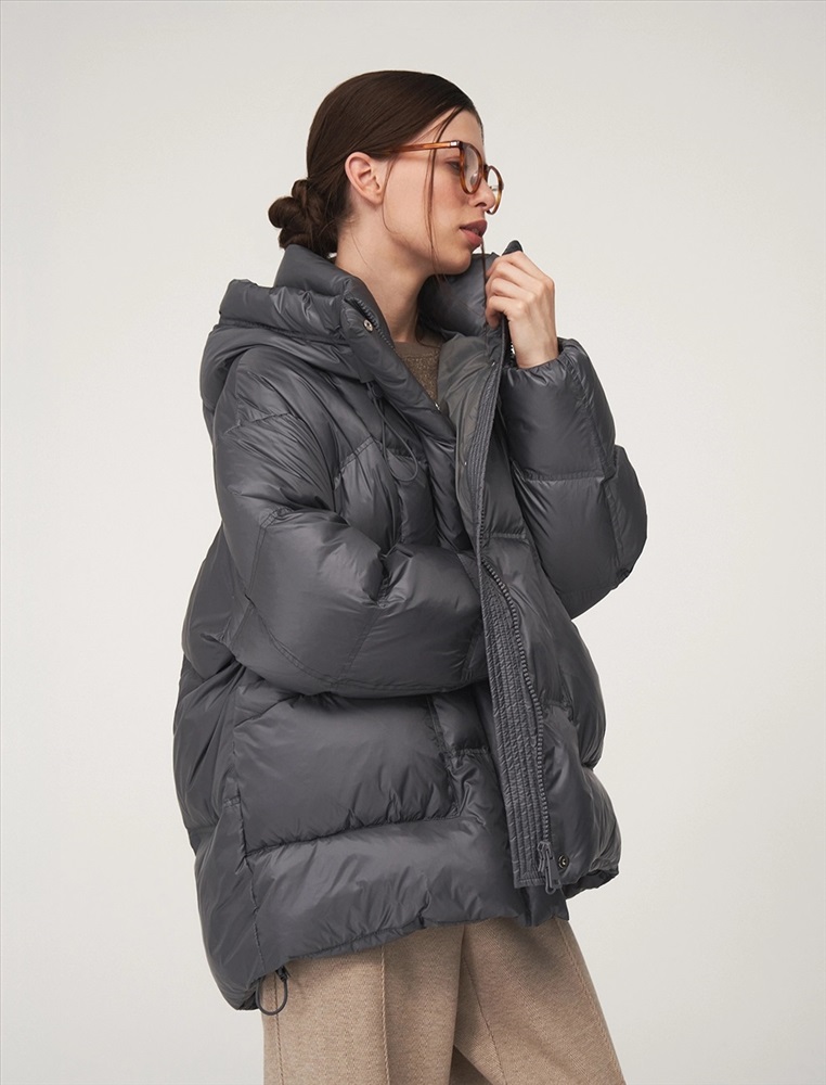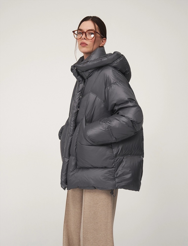Пуховик А-образного силуэта, длиной до уровня ниже бедра и спущенной линией плеча. Высокий воротник и капюшон защищают от ветра. По передней части планка с застежкой на молнию с двумя пуллерами. По бокам накладные карманы. По низу и по воротнику затяжники с фиксаторами. В составе утеплителя утиный пух (90%) и утиное перо. Представлен в серо-голубом оттенке.