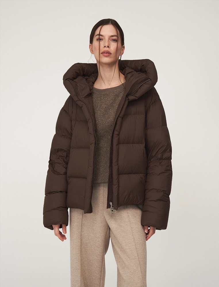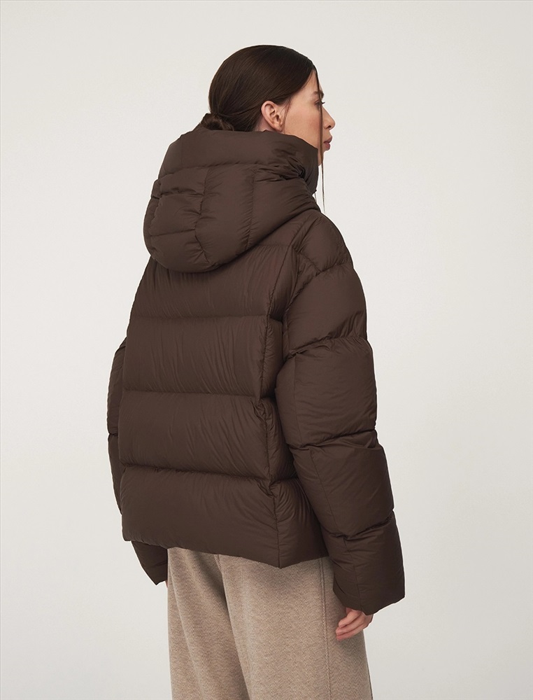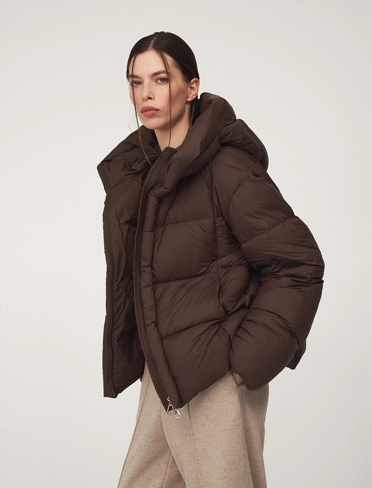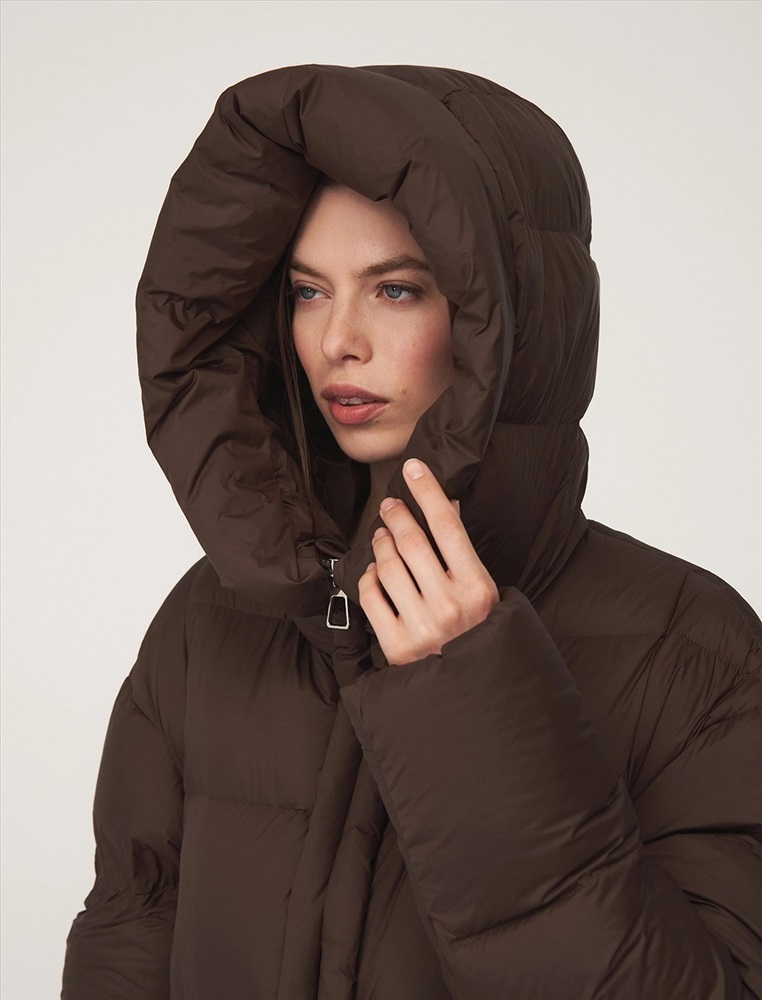 Пуховик О-образного силуэта, длиной до уровня бедра и спущенной линией плеча. Высокий воротник и капюшон защищают от ветра. По передней части планка с застежкой на молнию с двумя пуллерами. По бокам врезные карманы. По низу затяжники с фиксаторами. В составе утеплителя утиный пух (90%) и утиное перо. Представлен в благородном коричневом оттенке.