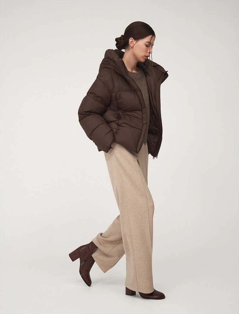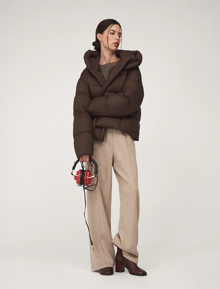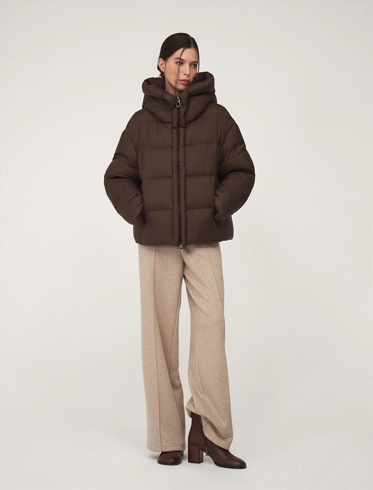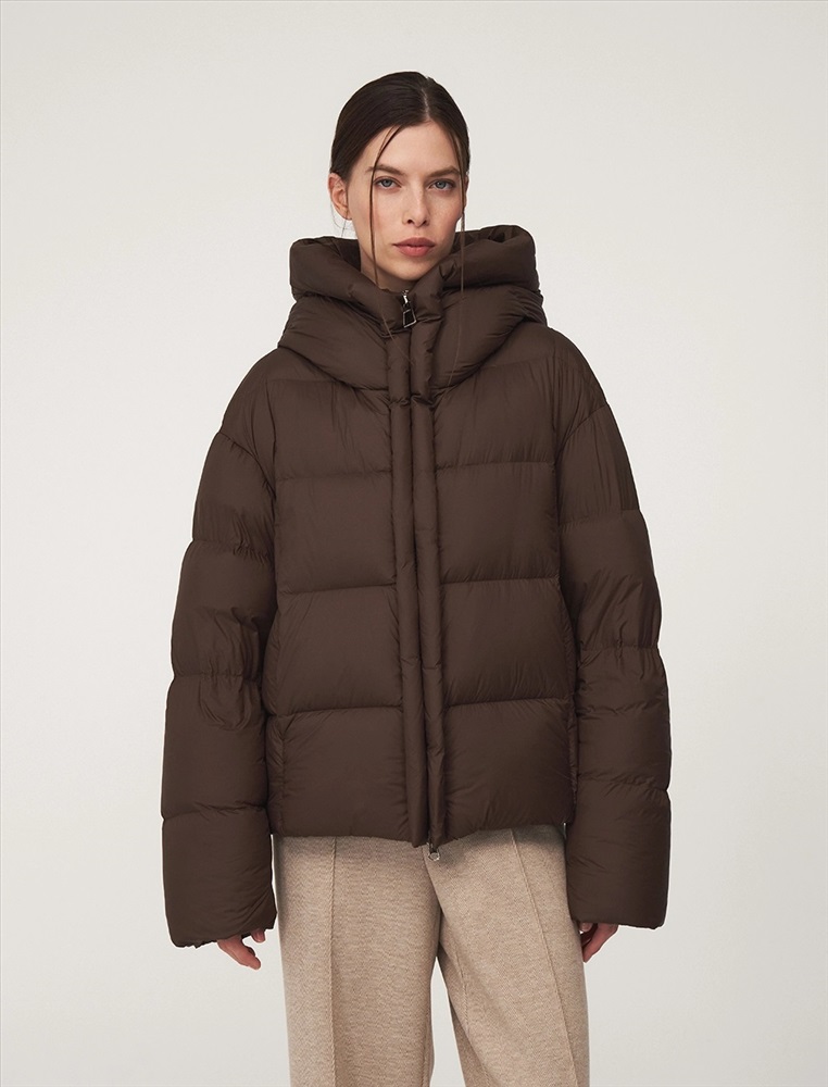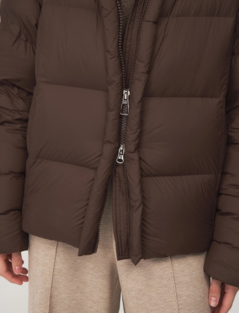 Пуховик О-образного силуэта, длиной до уровня бедра и спущенной линией плеча. Высокий воротник и капюшон защищают от ветра. По передней части планка с застежкой на молнию с двумя пуллерами. По бокам врезные карманы. По низу затяжники с фиксаторами. В составе утеплителя утиный пух (90%) и утиное перо. Представлен в благородном коричневом оттенке.