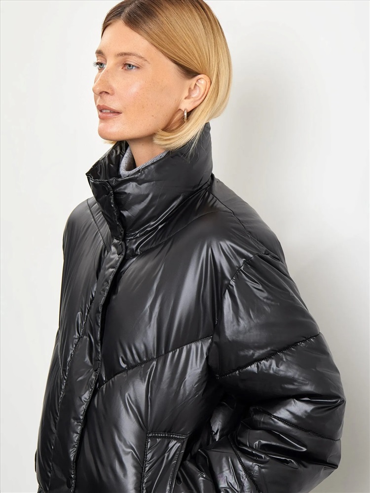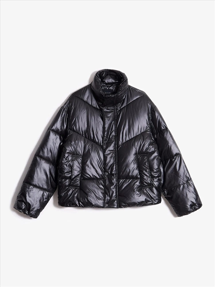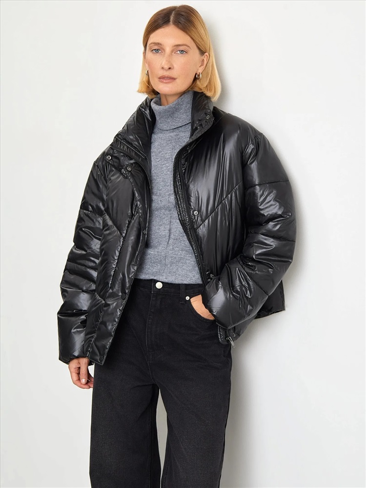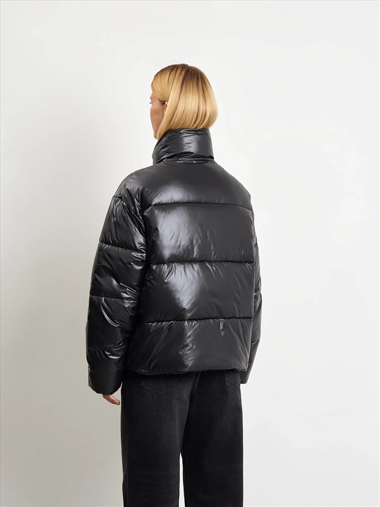 Модная короткая куртка в чёрном цвете из материала с глянцевым блеском. Утеплена искусственным пухом. Карманы утеплены флисом. Рассчитана на температуры до 5 °C. Модель прямого кроя имеет воротник-стойку. Застёгивается на удобную молнию.