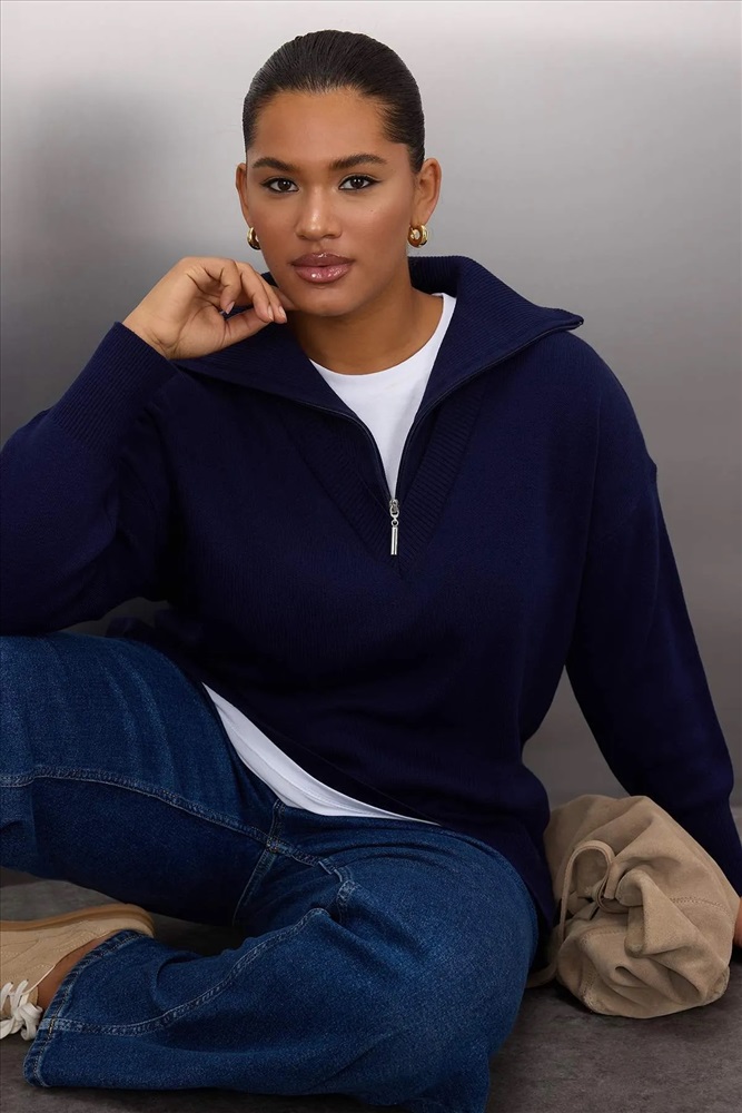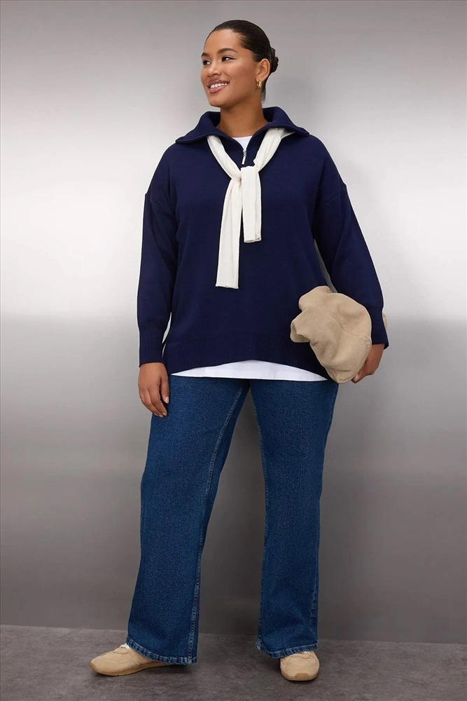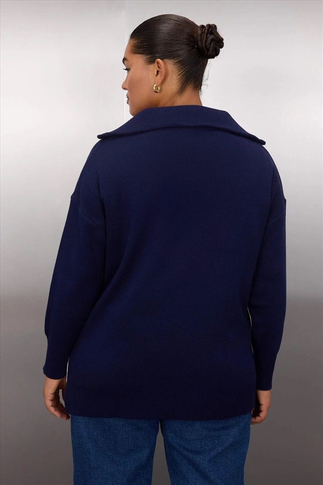 Lacivert Devrik Yaka Fermuarlı Triko Kazak TBBAW26AN00015
