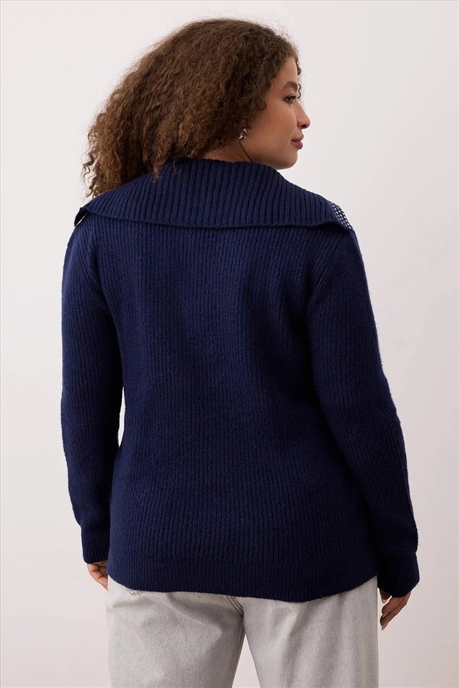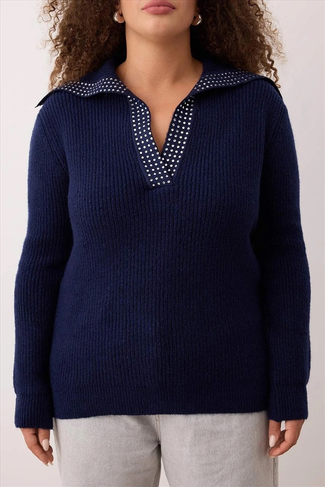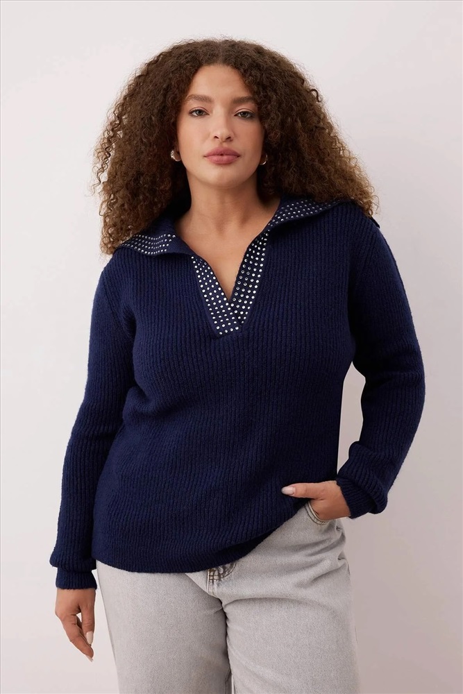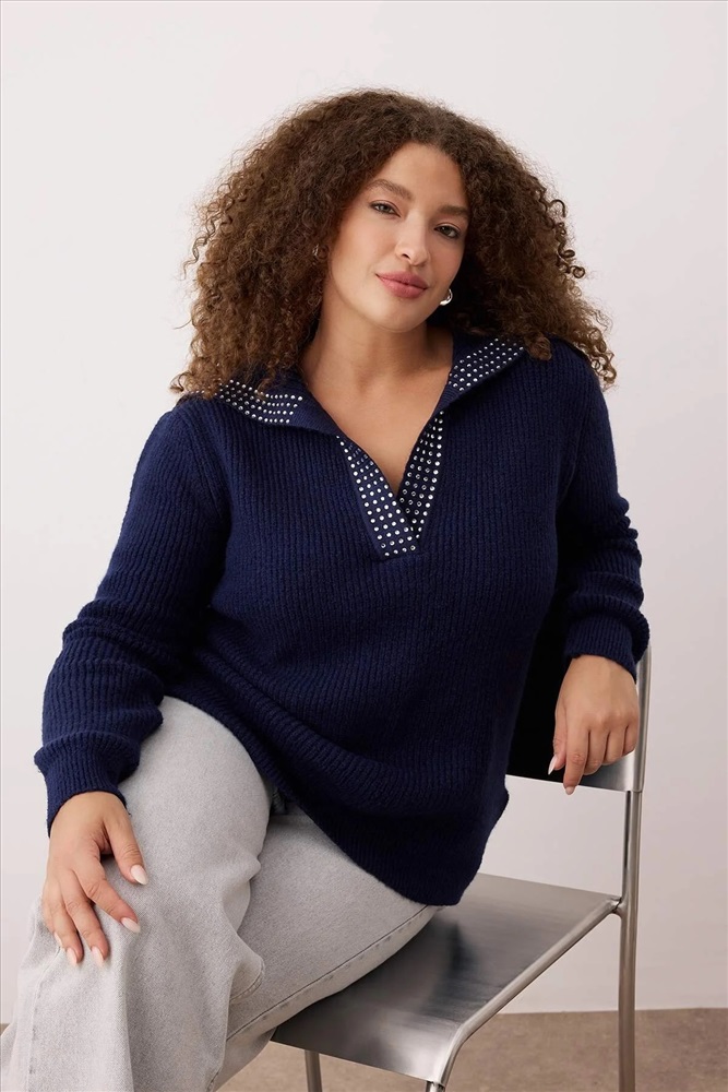 Lacivert Devrik Yaka Taş Detaylı Triko Kazak TBBAW26AN00044