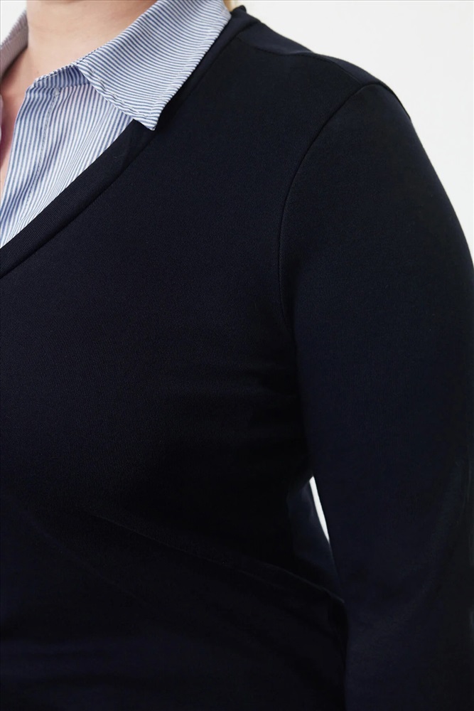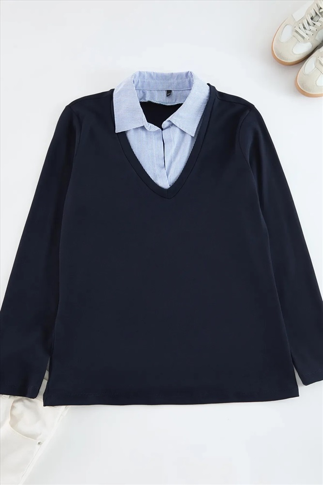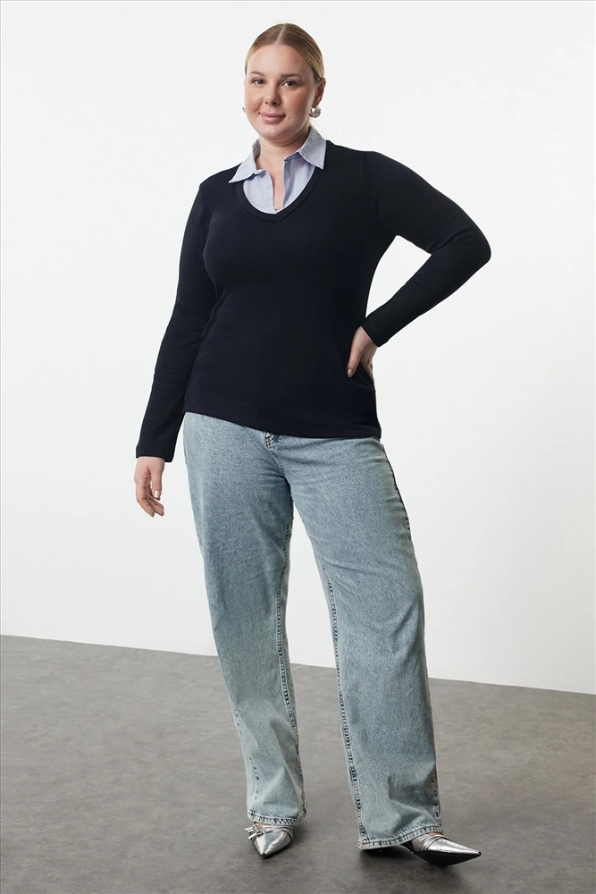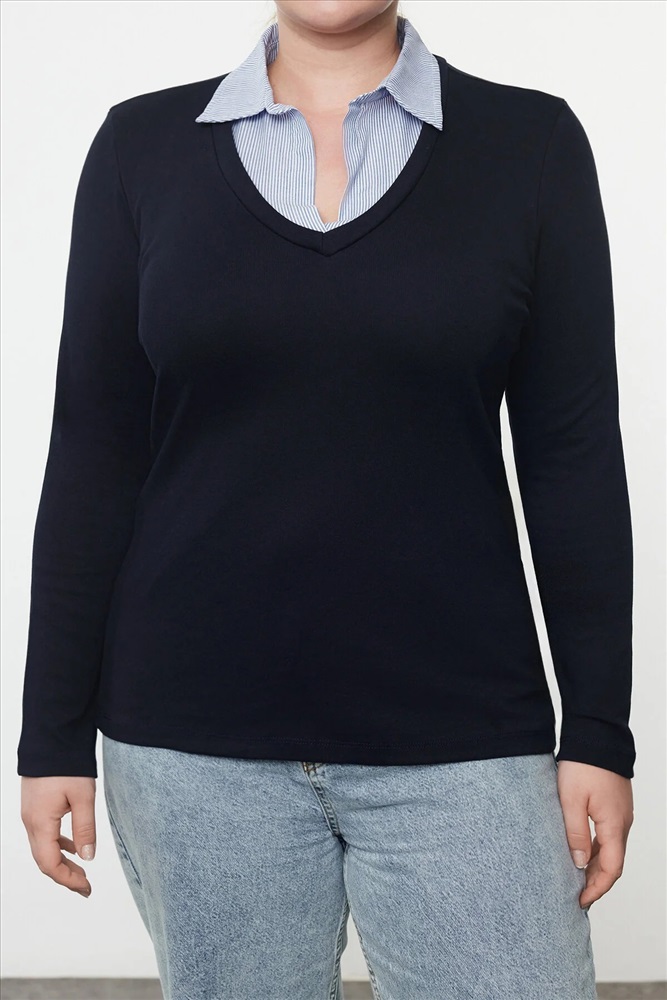 Lacivert Gömlek Yaka Detaylı Süprem Örme Büyük Beden Bluz TBBAW25AF00012