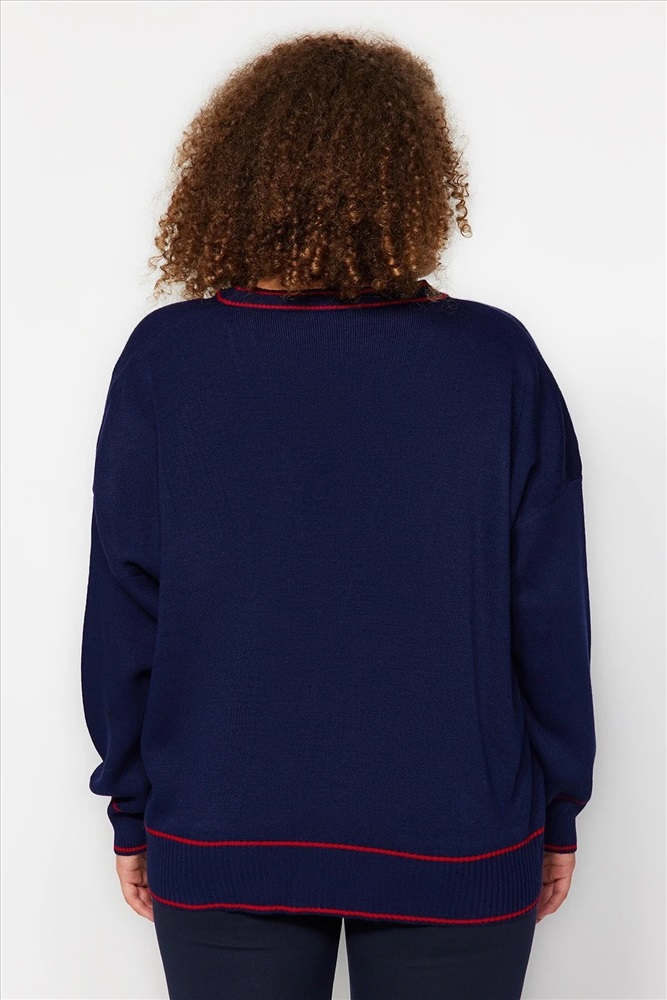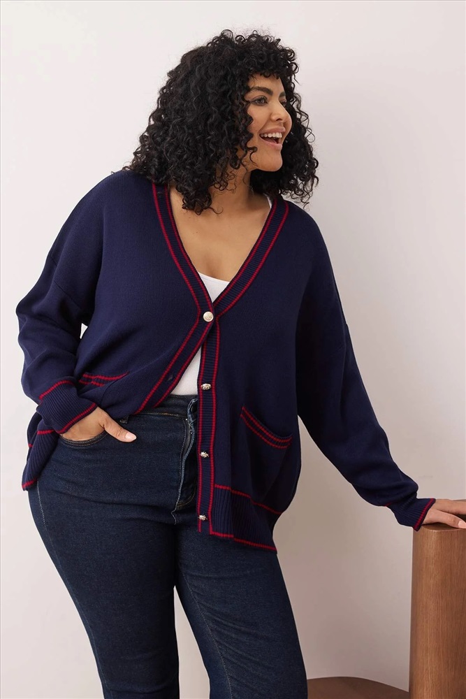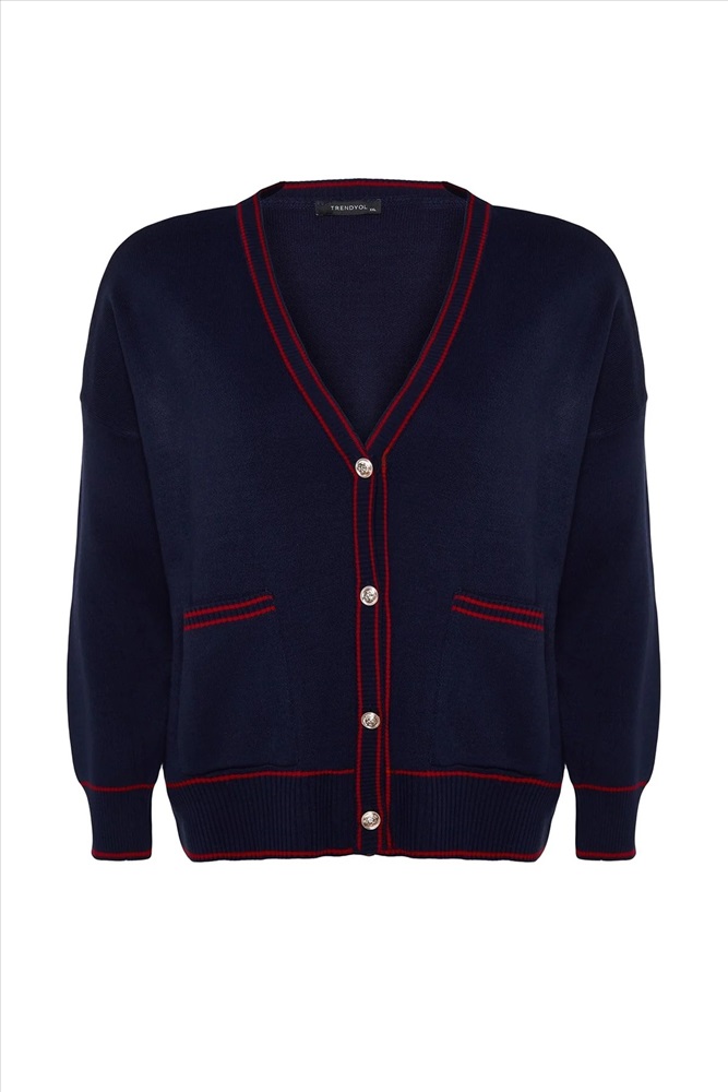 Lacivert-Kırmızı Çizgi Detaylı Triko Hırka TBBAW24AV00012