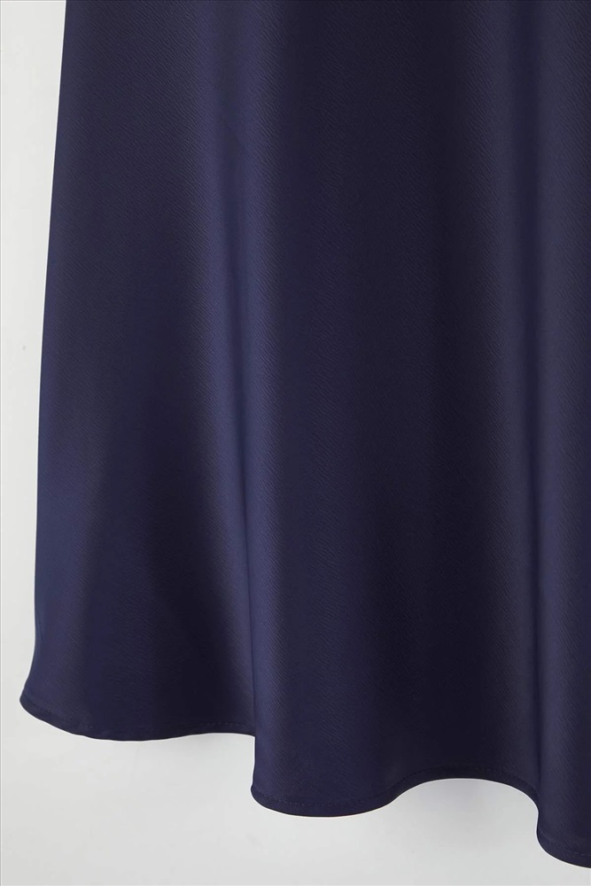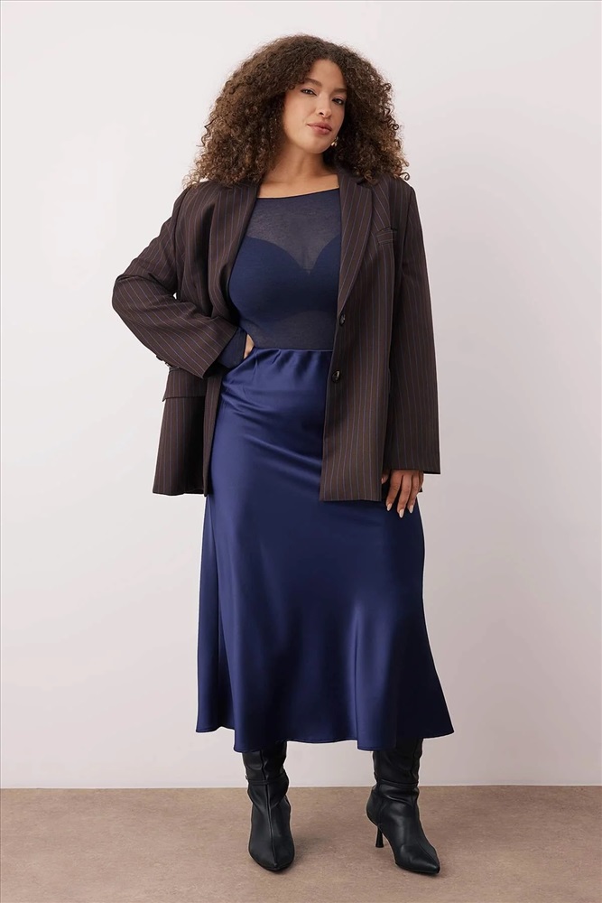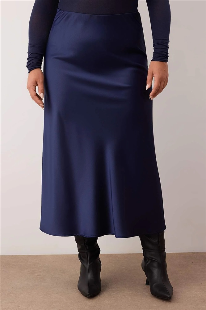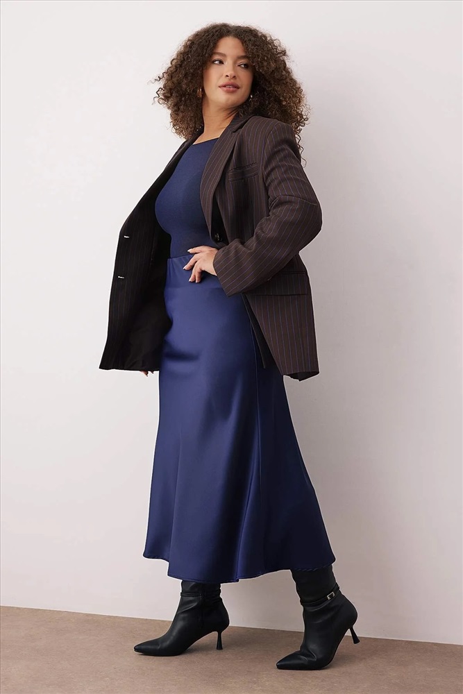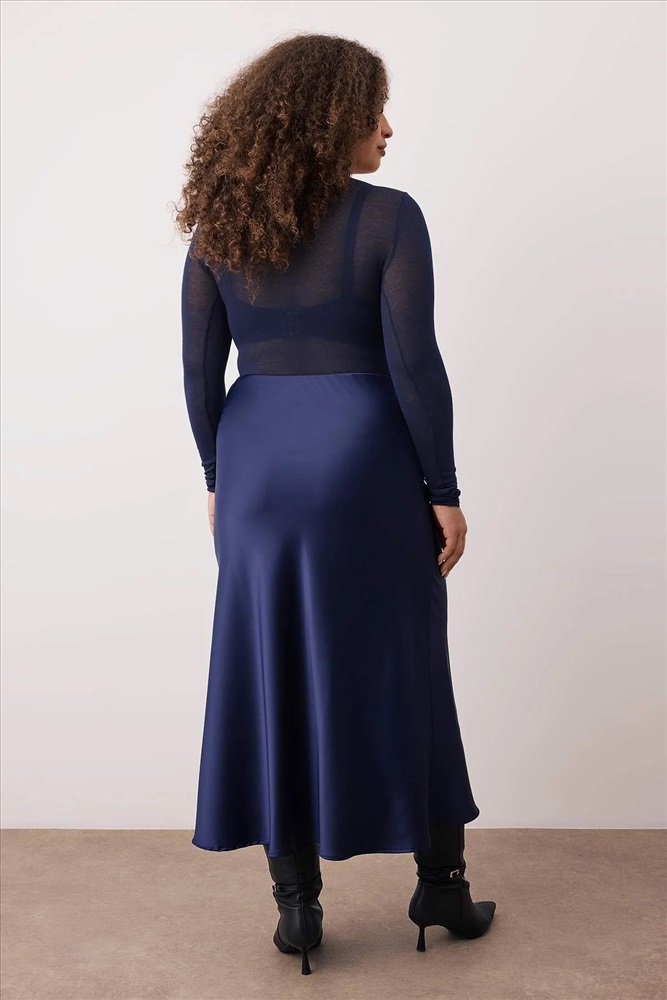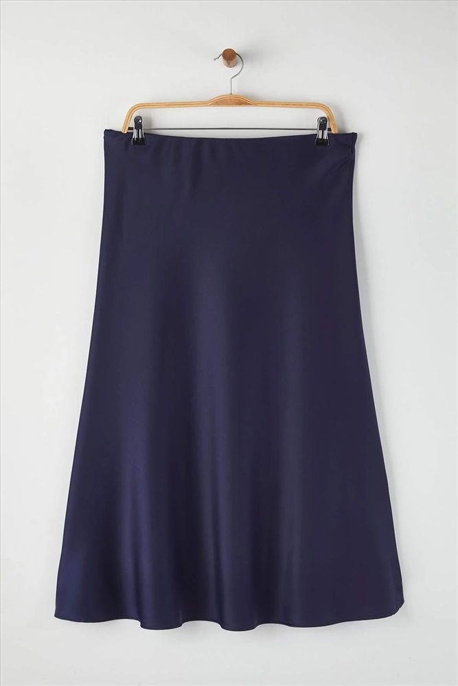 Lacivert Midi Boy Saten Dokuma Büyük Beden Etek TBBAW26AZ00008