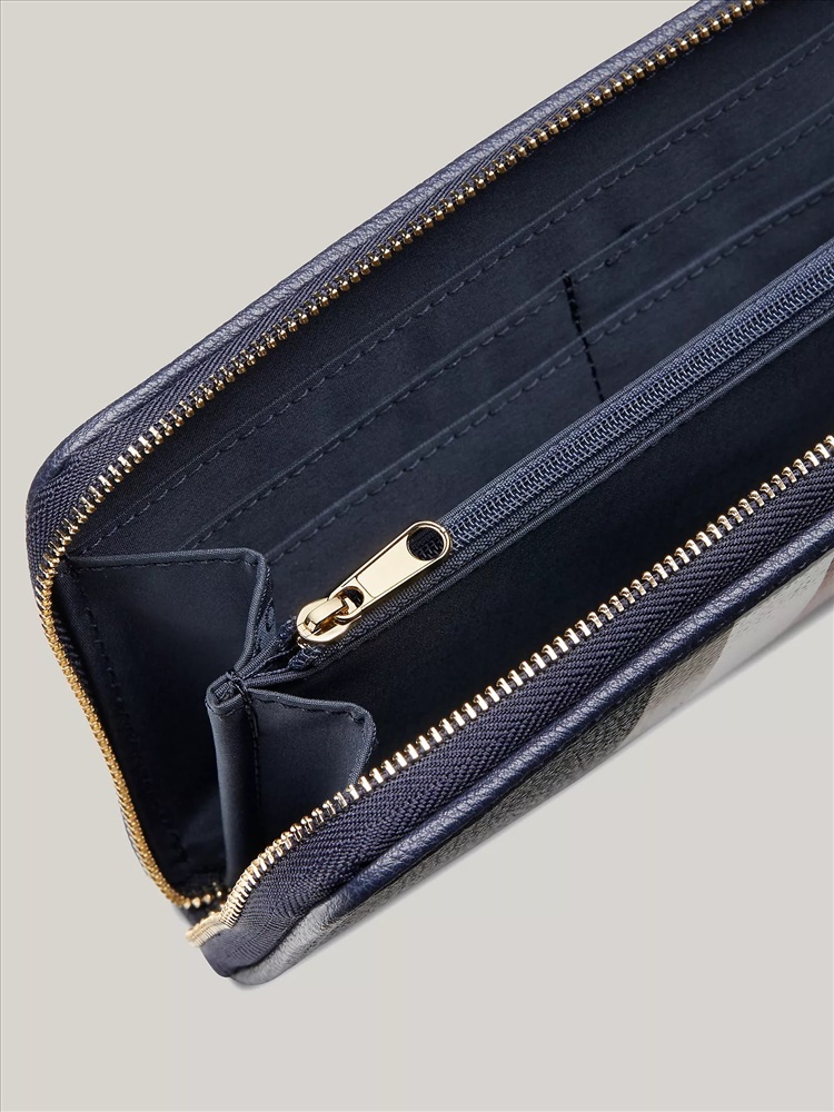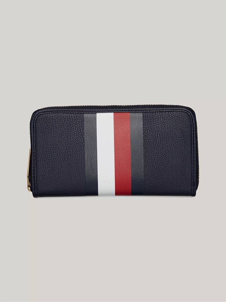 Tommy Hilfiger women's wallet. Finished with our signature stripes, this large wallet features a zip-around closure giving you easy access to cards and cash.
