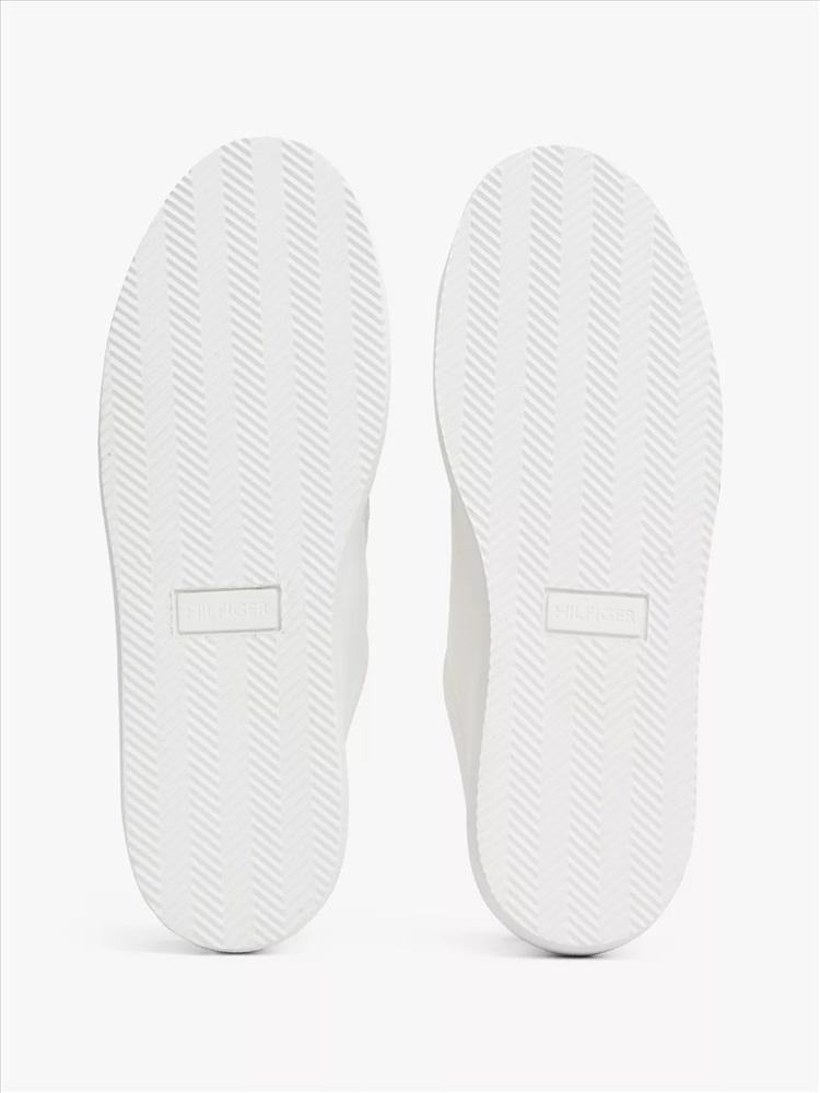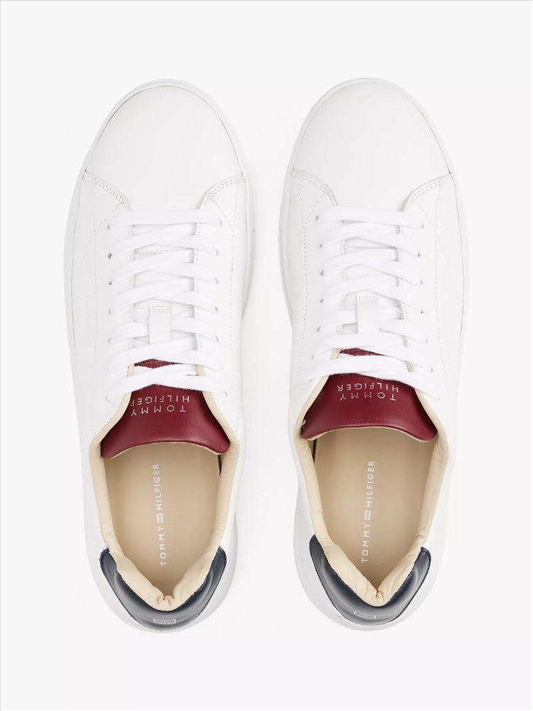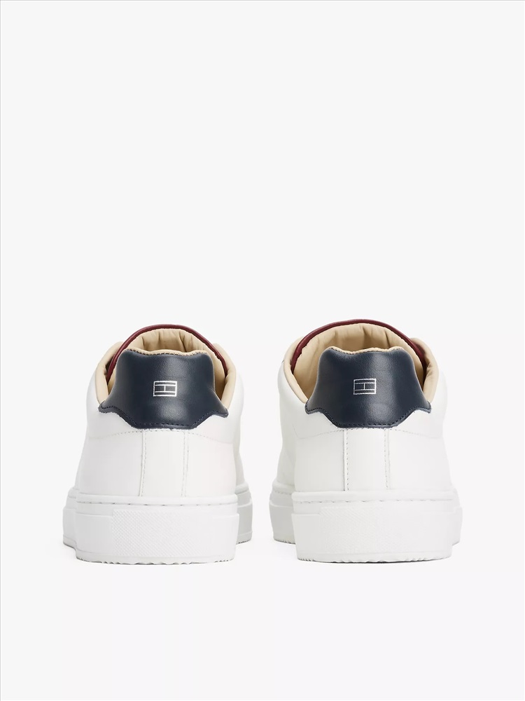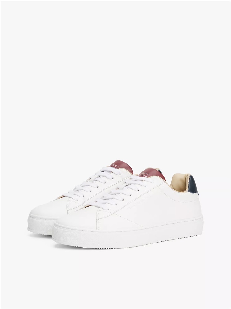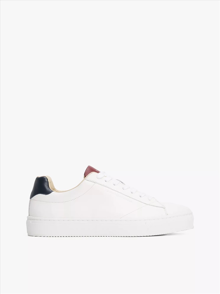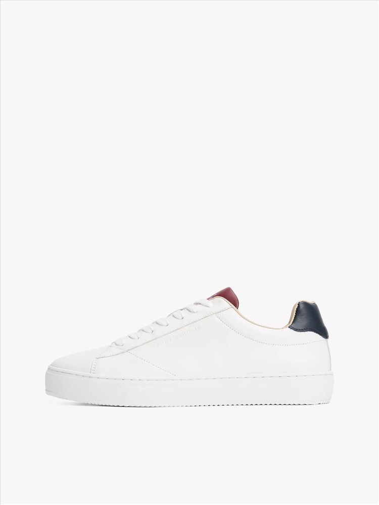 Tommy Hilfiger men's sneaker. With subtle branded elements and a smooth leather finish, these low-top sneakers add luxe athleisure vibes to your casual outfits.
