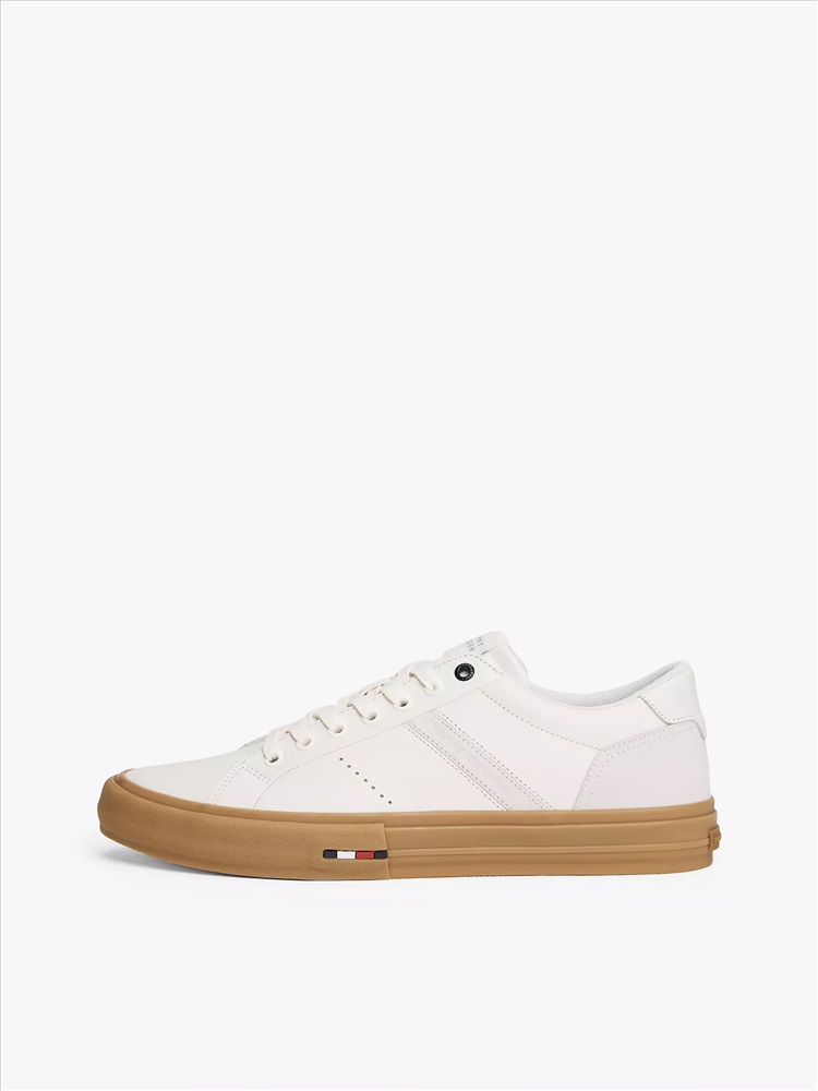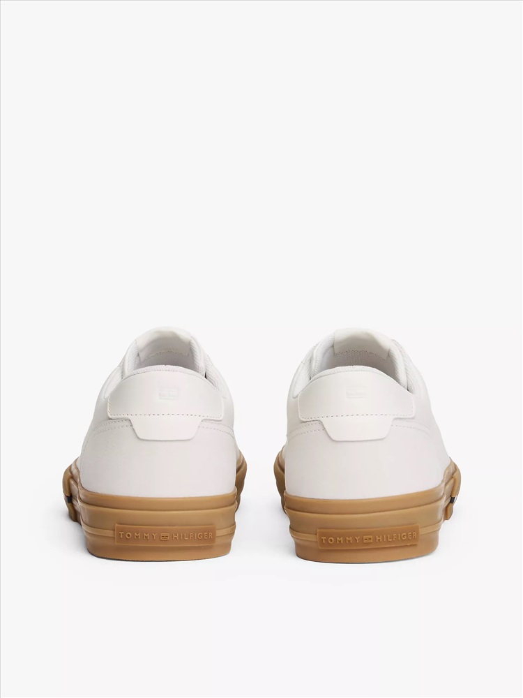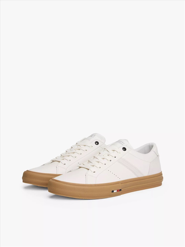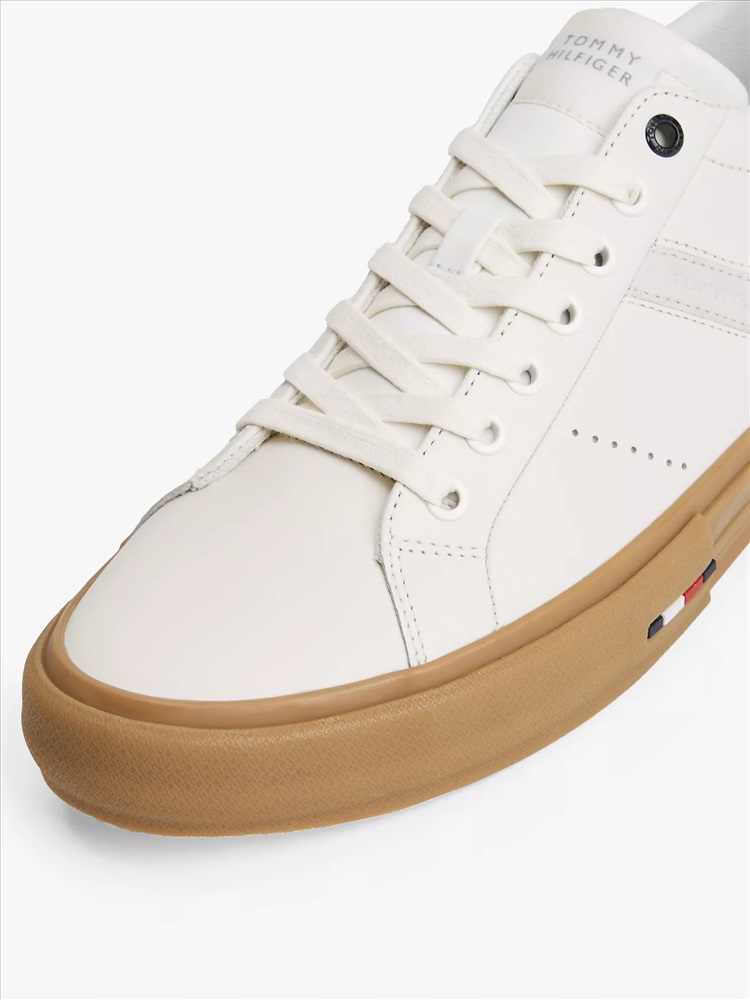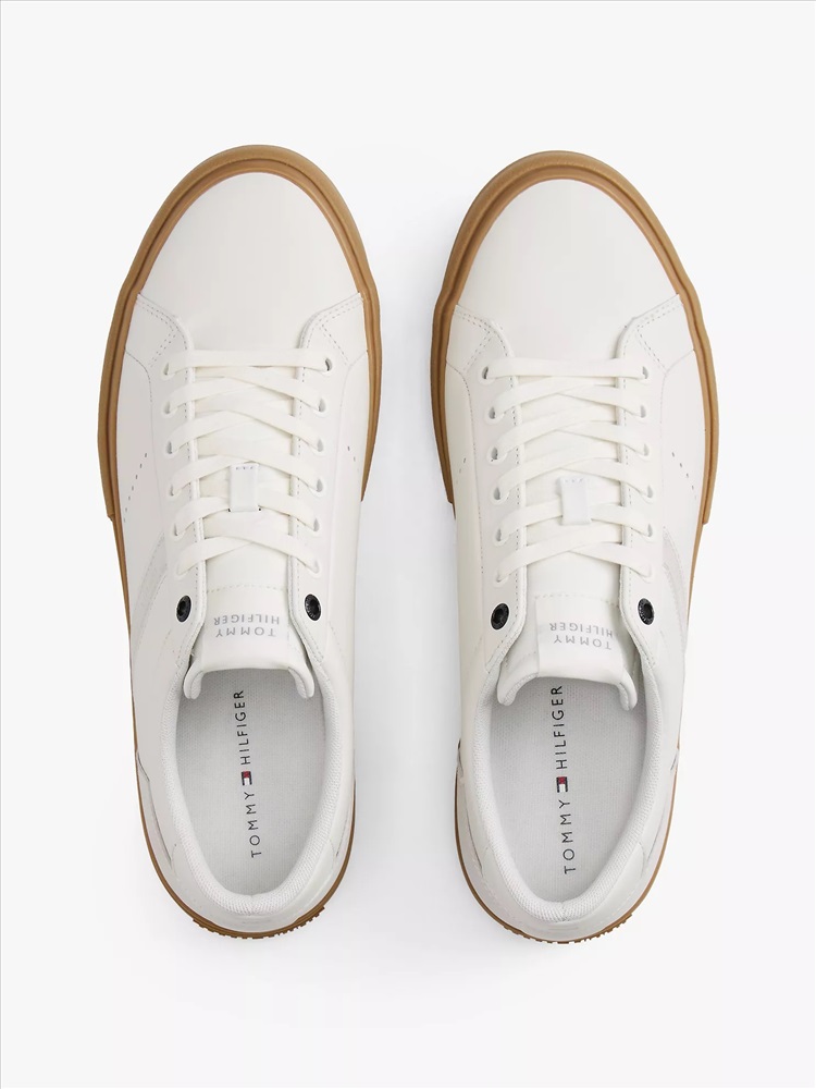 Tommy Hilfiger men's sneaker. For the minimalist, these classic leather low-top sneakers are designed with a lace-up vamp and subtle branding. We finished this pair with a heat-treated, vulcanized sole for added flex and durability.
