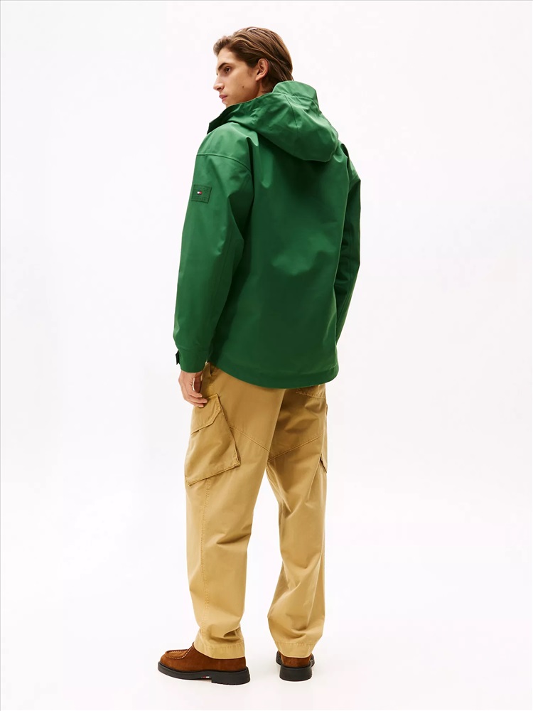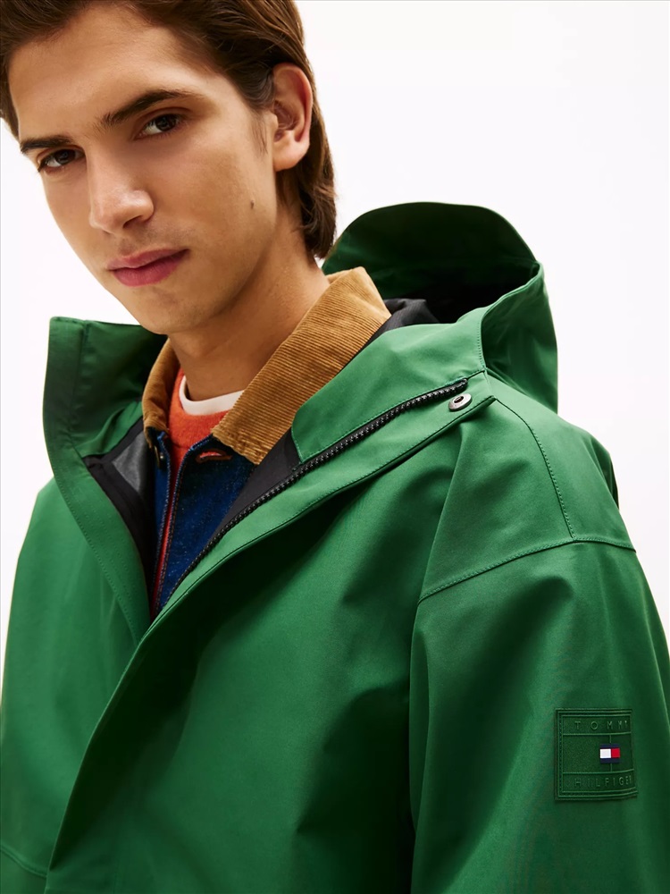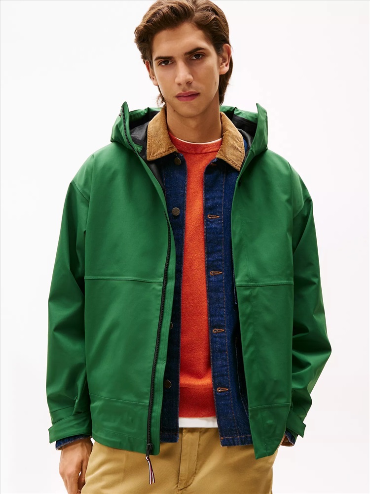 Tommy Hilfiger men's jacket. Every commuter's dream — a lightweight hooded jacket that you can just throw on and go, whatever the weather. This one is constructed with a zip and snap closure, touch-fastener cuffs and a specialized drawcord hood that adjusts at the front and back.