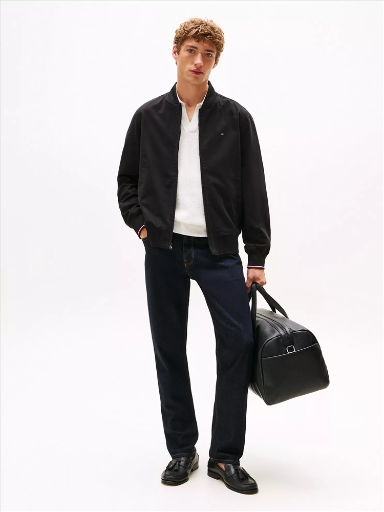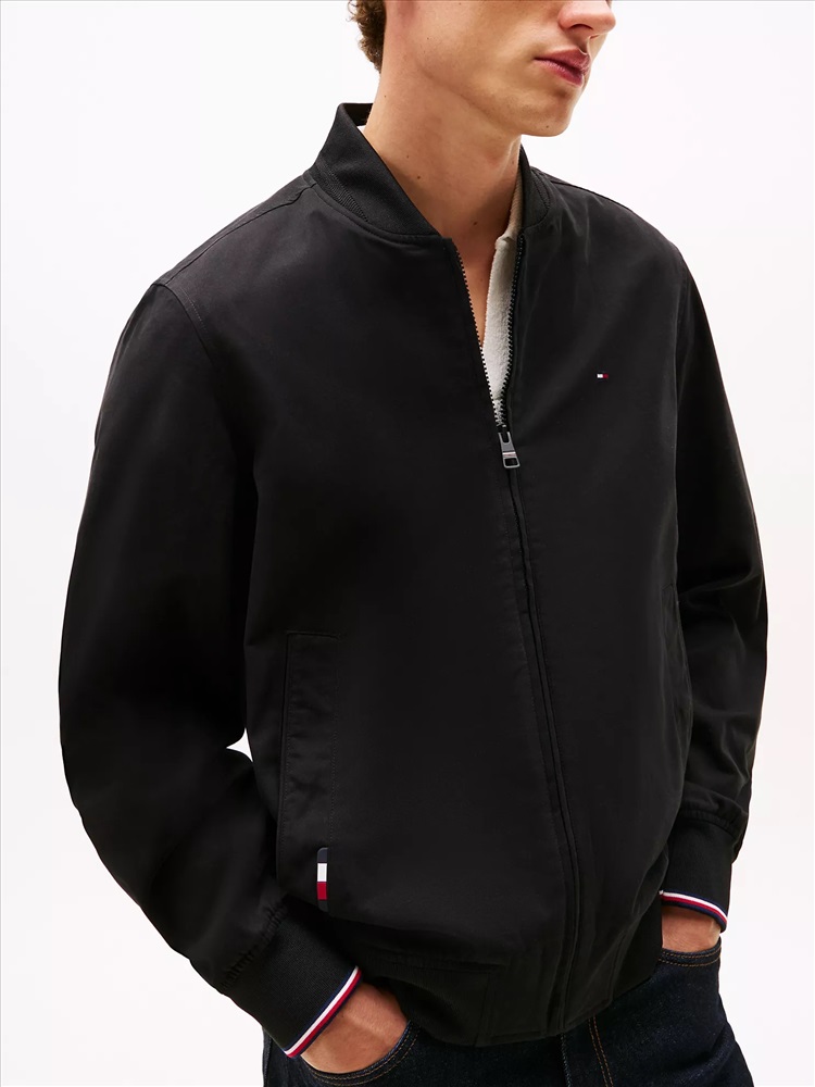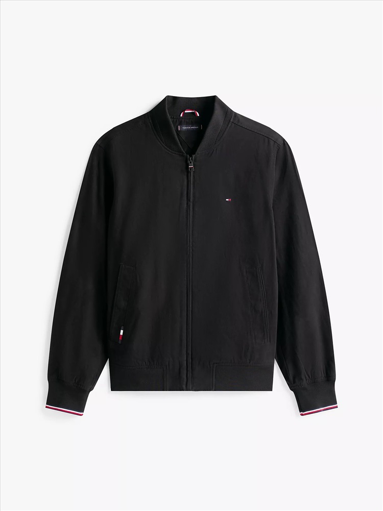 Tommy Hilfiger men's jacket. Effortlessly cool and ready for anything, our lightweight bomber brings a fresh twist to a classic silhouette. Made from cotton twill for breathable comfort and durability, it’s the ideal layer for stepping up your everyday style.