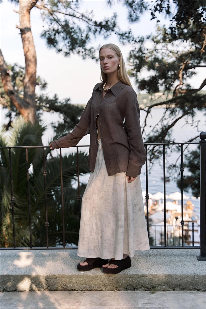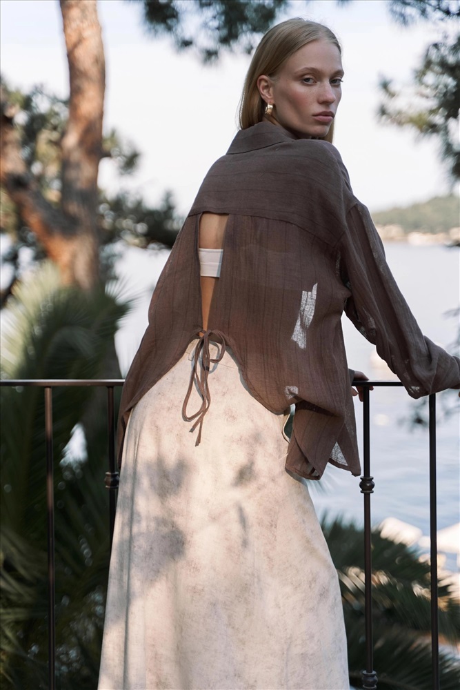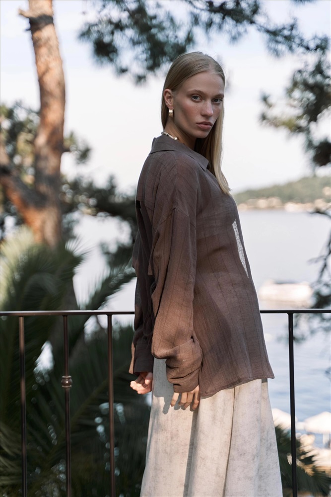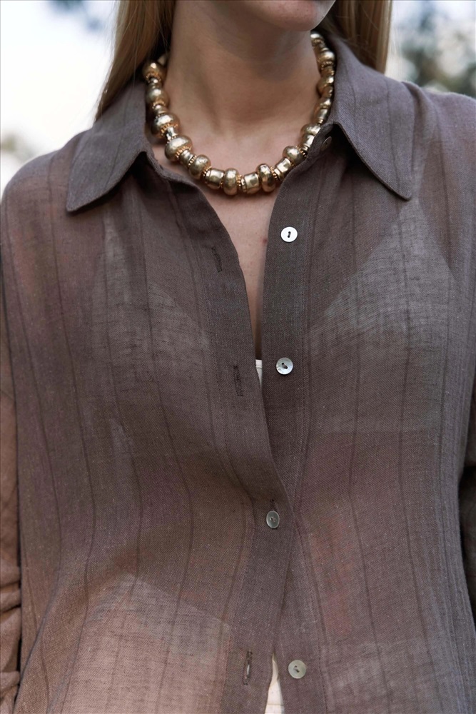 Рубашка оверсайз оверсайз с глубоким вырезом и шнуровкой, длинными рукавами, прозрачной льняной.