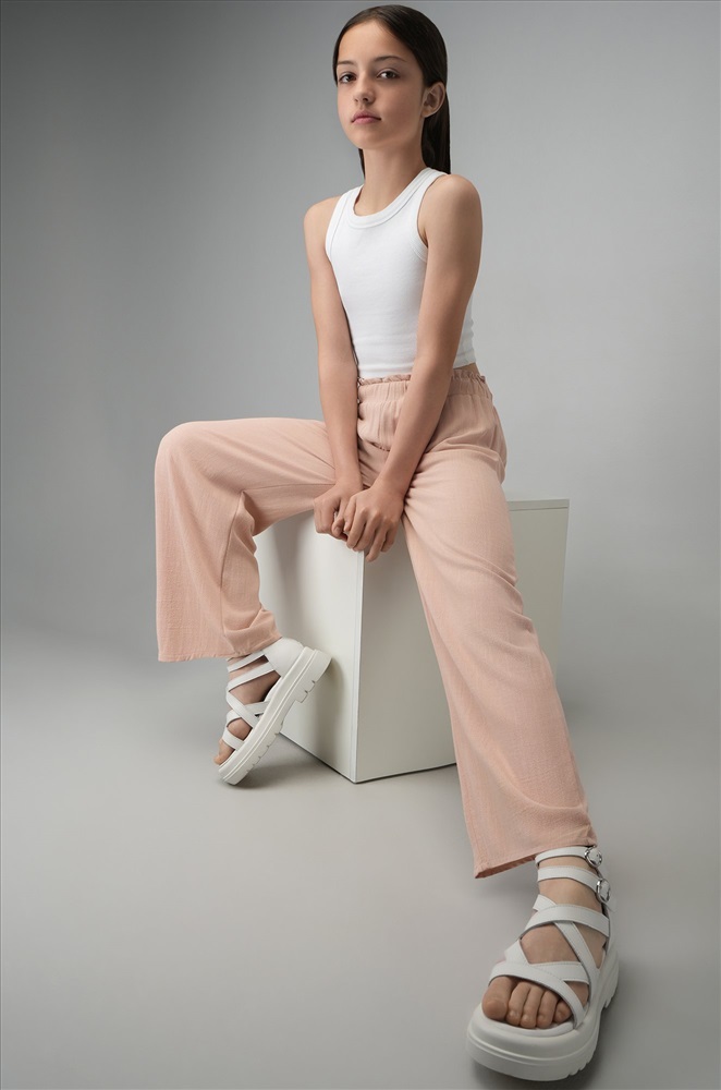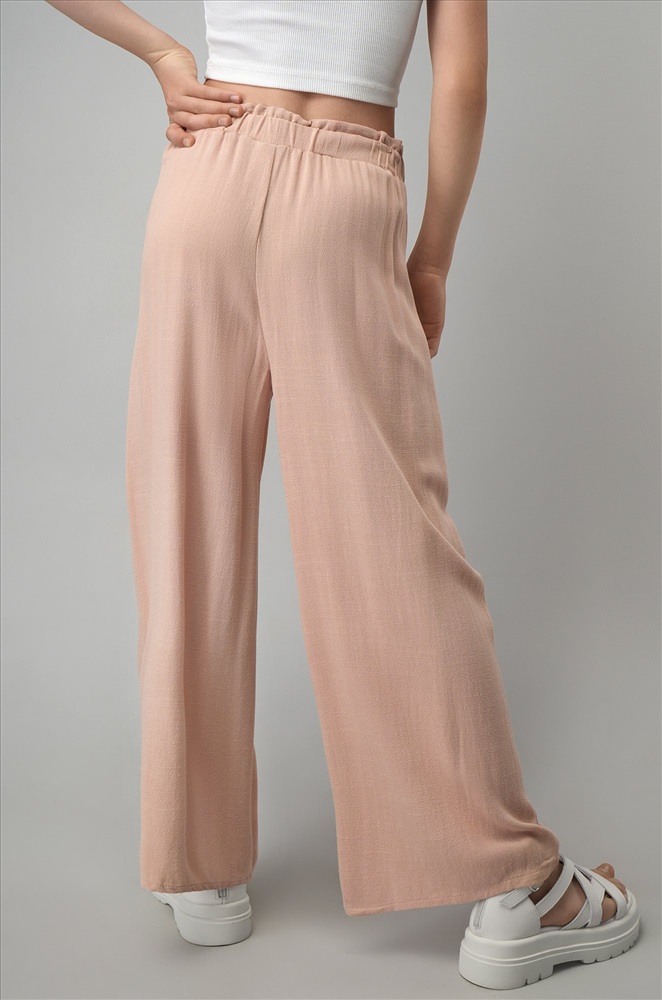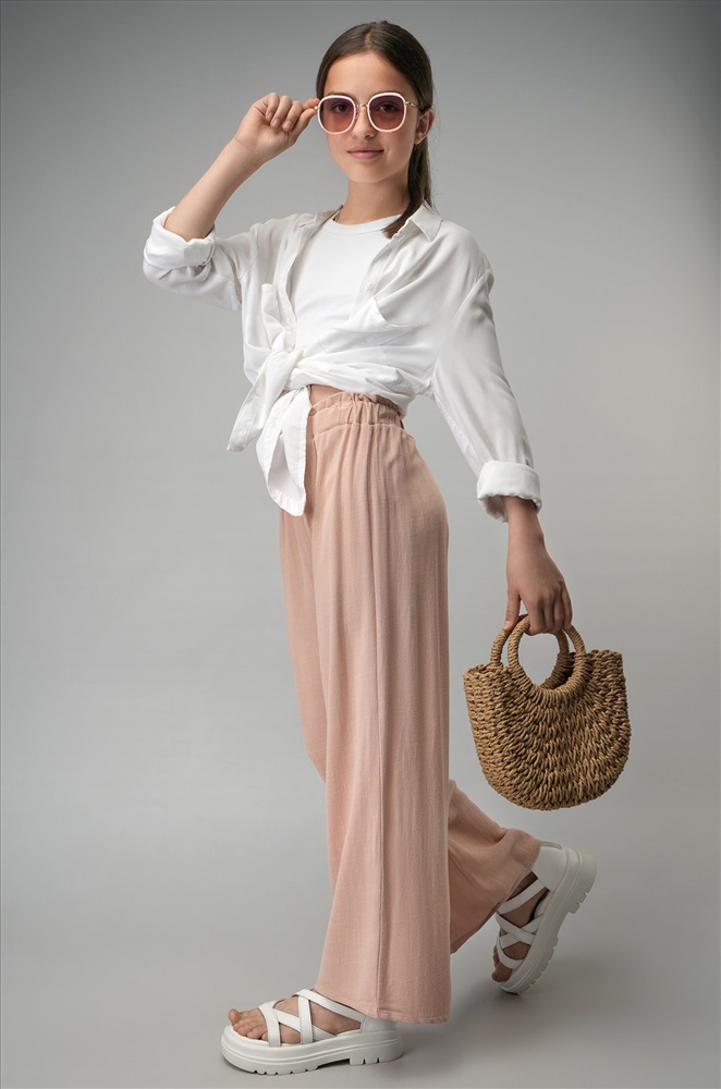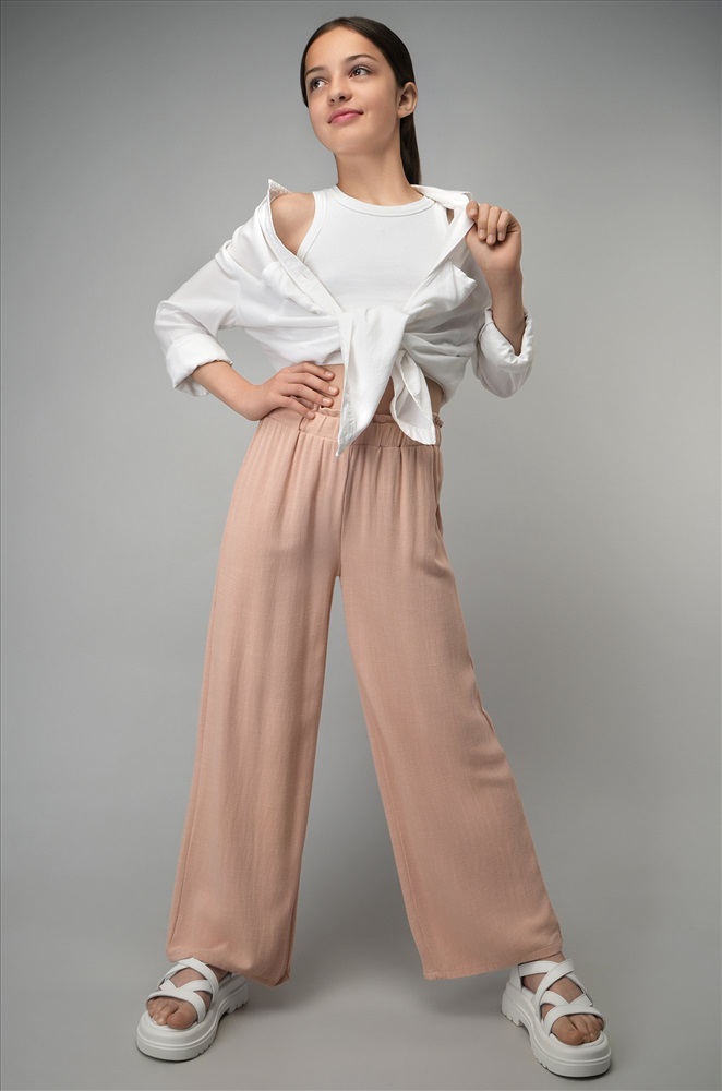 Однотонные льняные брюки для девочки представлены в нежном розовом цвете. Комфортные, широкие — для тех, кто любит свободу в движении и стиле.