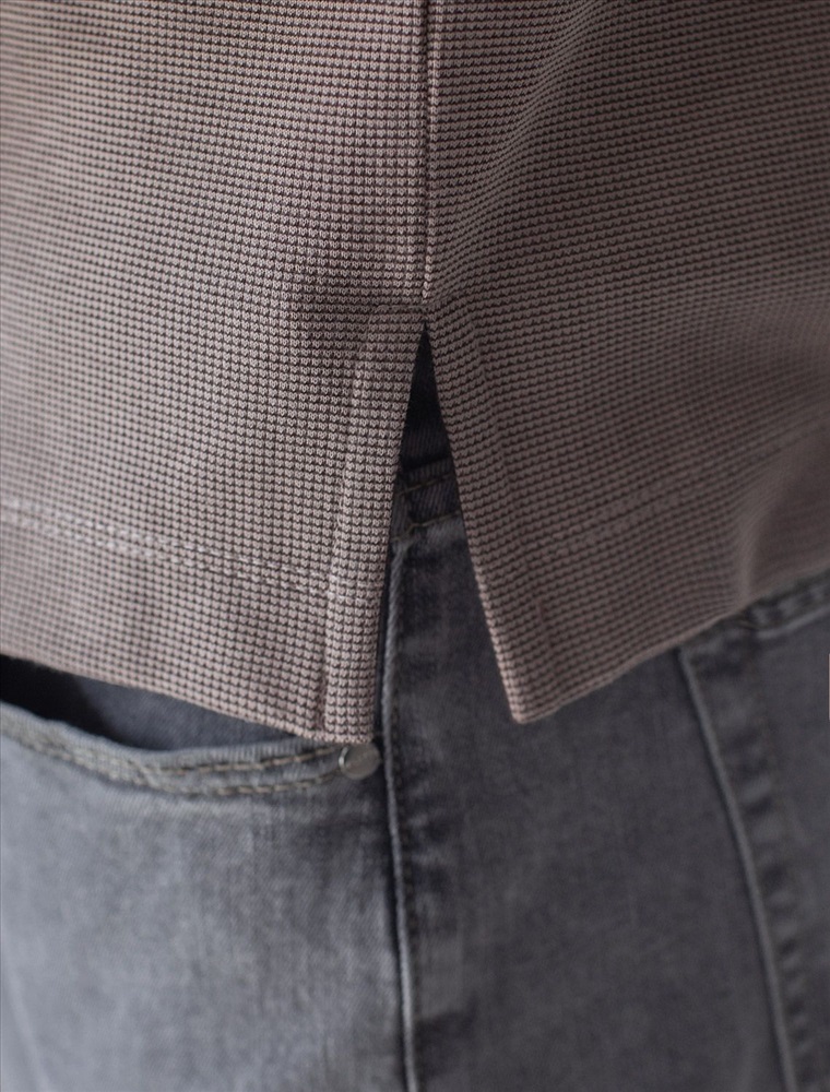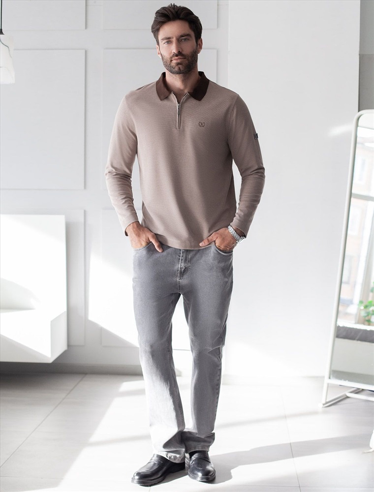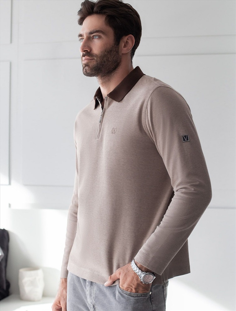 Стильный лонгслив коричневого цвета с плетеным воротником поло с застежкой на молнию выполнен из премиального хлопка в сочетании с эластаном .Невероятно мягкая ткань из натуральных волокон - она едва ощутима на коже и словно обнимает тело. Материал при касании кажется бархатистым, при движении он словно повторяет все мельчайшие линии фигуры. По свойствам материал сочетает в себе практичность и нежность: отлично провускает воздух, сохраняя ощущение свежести в течение всего дня, при этом созраняет тепло в прохладную погоду.Идеально подходит для чувствительной кожи, не вызывает раздражения и дискомфорта. Удобный отложной контрастный воротник делает образ современным и стильным, а длинные рукава с манжетами защищают руки при ветреной погоде.