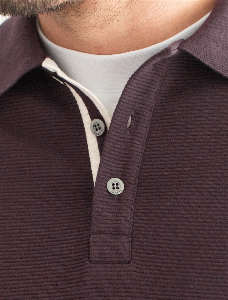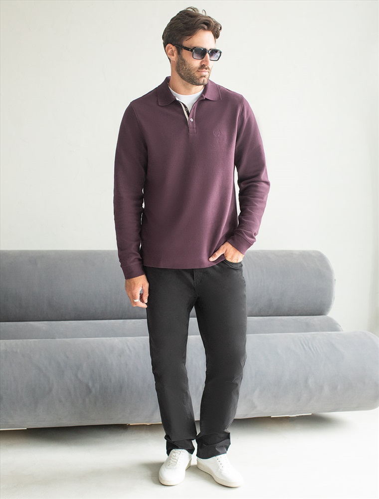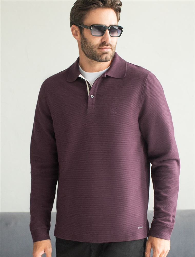 Стильный лонгслив цвета бургунди с плетеным воротником поло с застежкой на металлические пуговицы выполнен из премиального хлопка в сочетании с эластаном . Невероятно мягкая ткань из натуральных волокон - она едва ощутима на коже и словно обнимает тело. Материал при касании кажется бархатистым, при движении он словно повторяет все мельчайшие линии фигуры. По свойствам материал сочетает в себе практичность и нежность: отлично пропускает воздух, сохраняя ощущение свежести в течение всего дня, при этом в нем тепло в прохладную погоду.Идеально подходит для чувствительной кожи, не вызывает раздражения и дискомфорта. Удобный отложной воротник с контрастной отделкой делает образ современным и стильным, а длинные рукава с манжетами защищают руки при ветреной погоде.