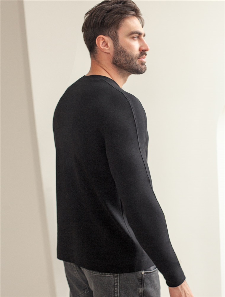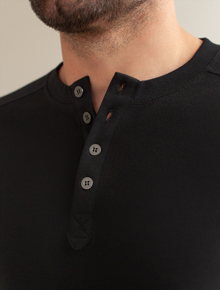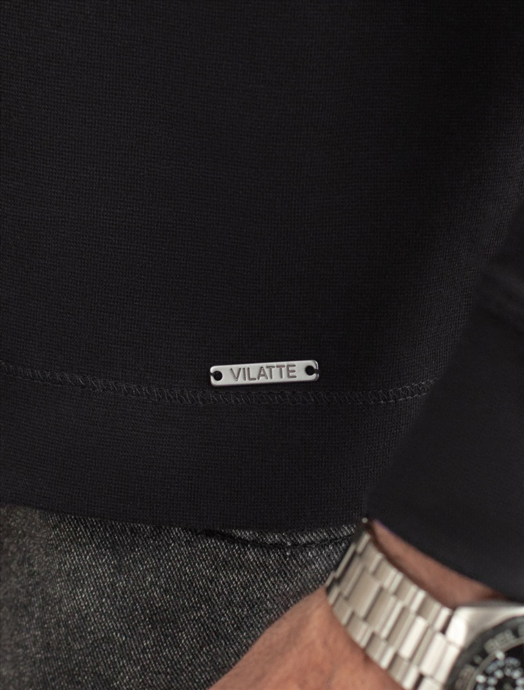 Лонгслив черного цвета выполнен из премиального хлопка с эластаном и идеально подходит для повседневной носки. Круглый ворот с застежкой на металлические пуговицы с логотипом бренда добавляет образу стильный акцент, делая этот лонгслив универсальным выбором как для парней, так и для мужчин любого возраста. Декоративные швы на рукавах и минималистичная вышивка в виде эмблемы VILATTE придают лонгу современный вид и подчеркивают его уникальность.