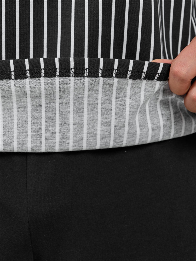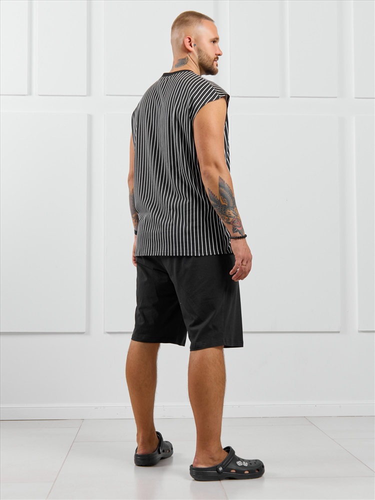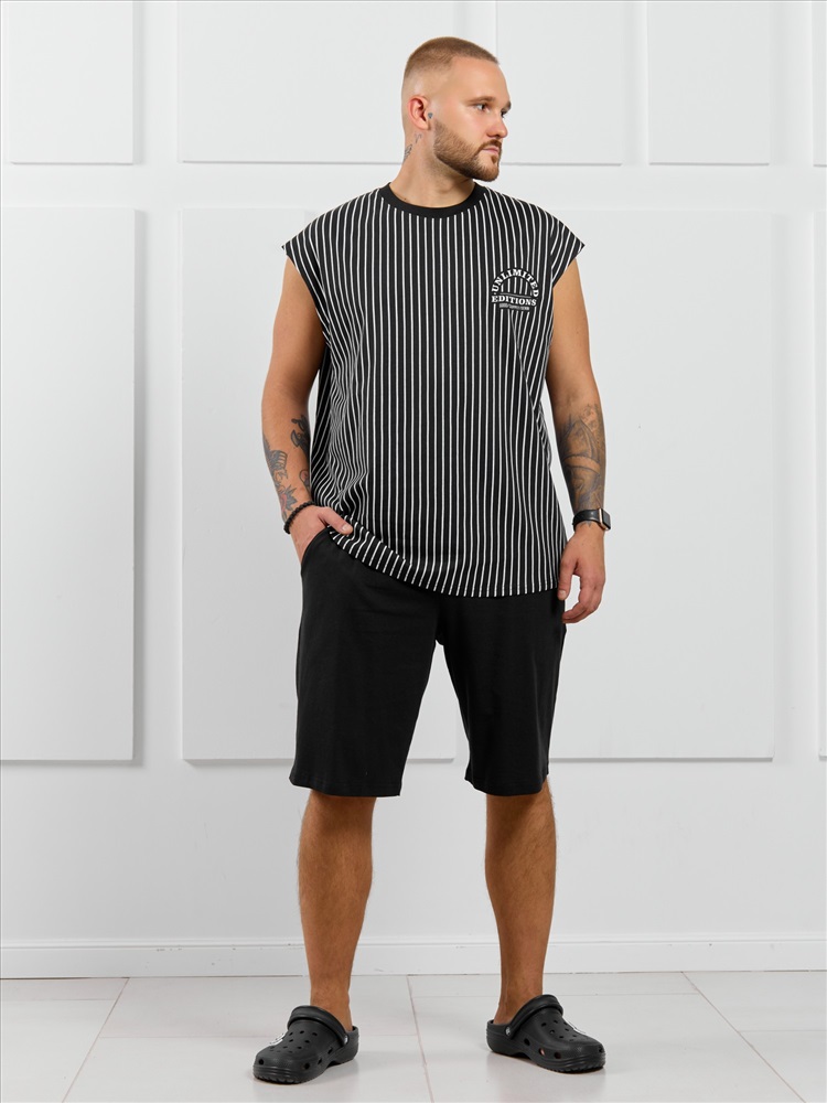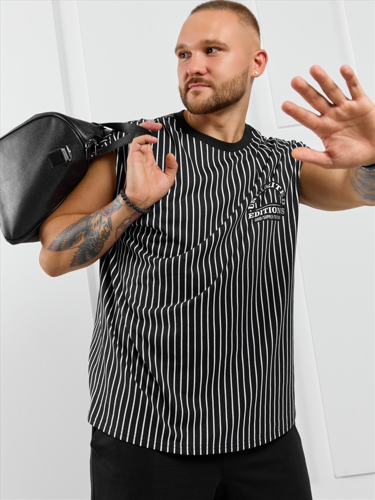 Майка мужская из трикотажного полотна с набивным рисунком в узкую черно-белую полоску. Модель свободная, со спущенной линией плеч, с принтом на груди. Овальная горловина обработана однотонно деталью.