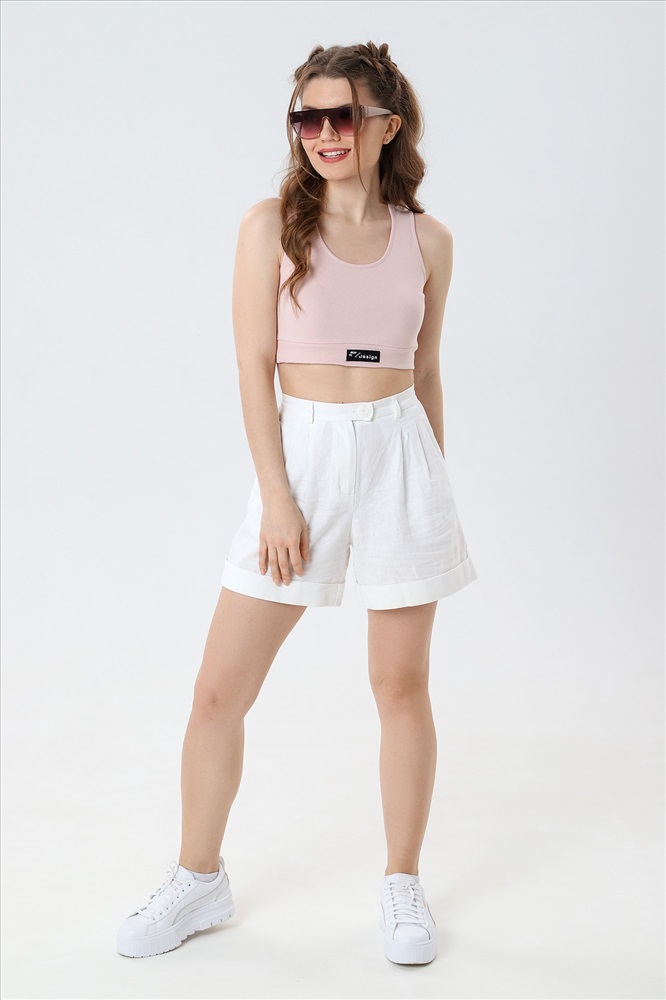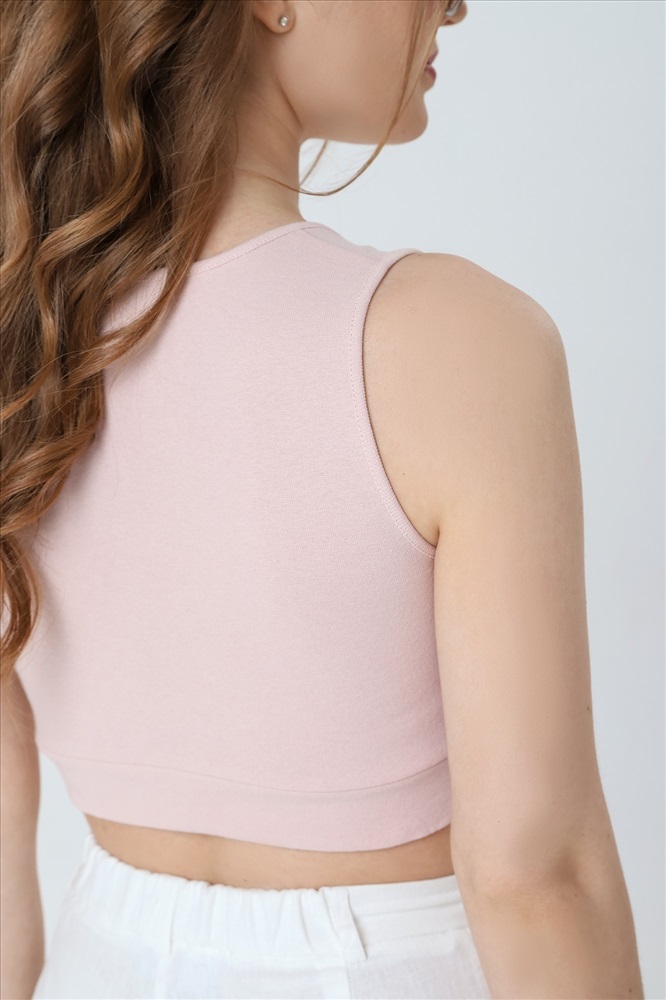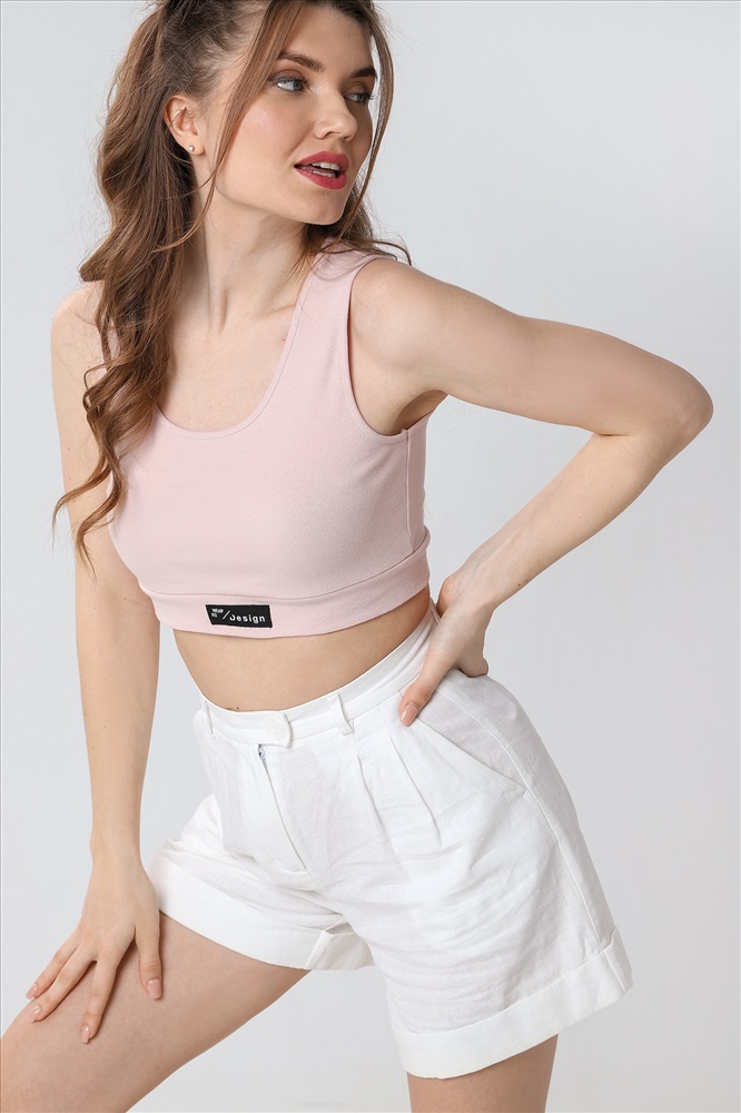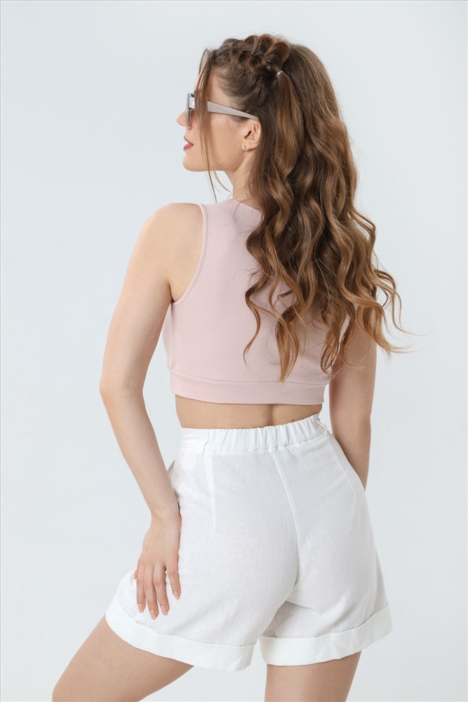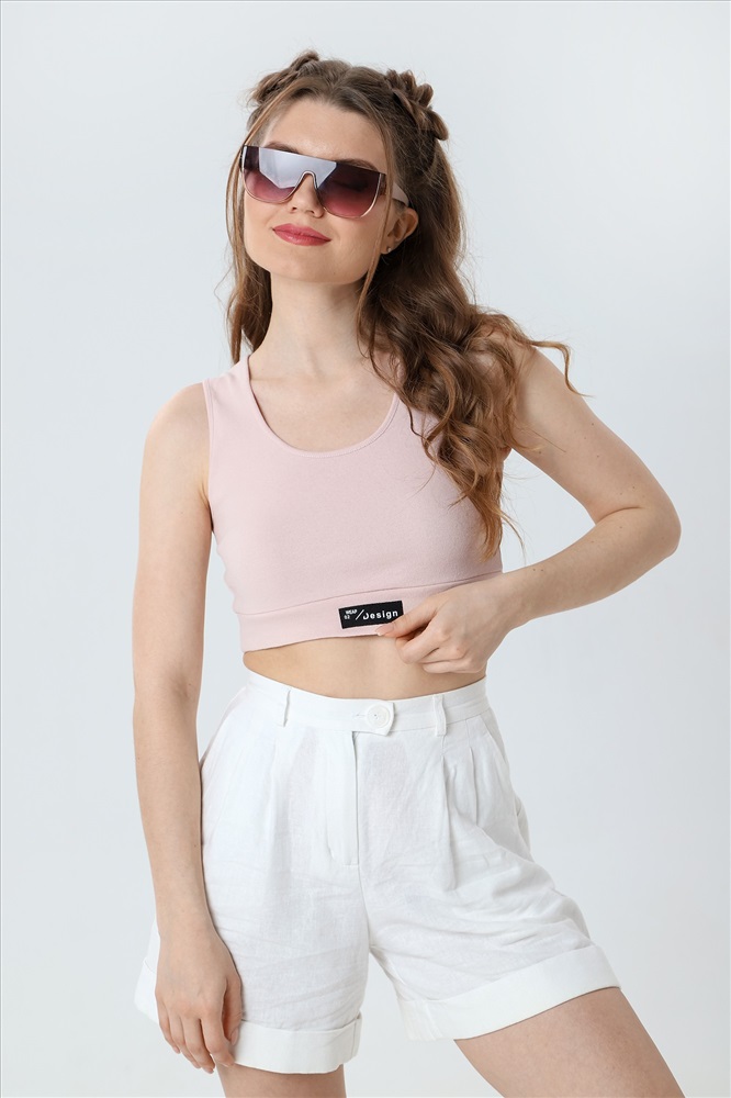 Кроп-топ – из полотна «рибана» без рукавов, с горловиной овальной формы, обработанной окантовкой из основного материала и притачным поясом по низу. В центре пояса настрочен декоративный элемент.