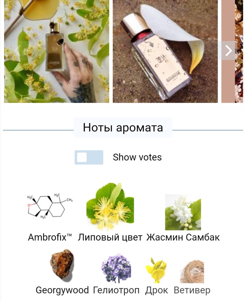 Верхние ноты: Липовый цвет и Дрок; Средние ноты: Гелиотроп, Жасмин Самбак и Ветивер;Базовые ноты: Ambroxan и Древесные ноты.