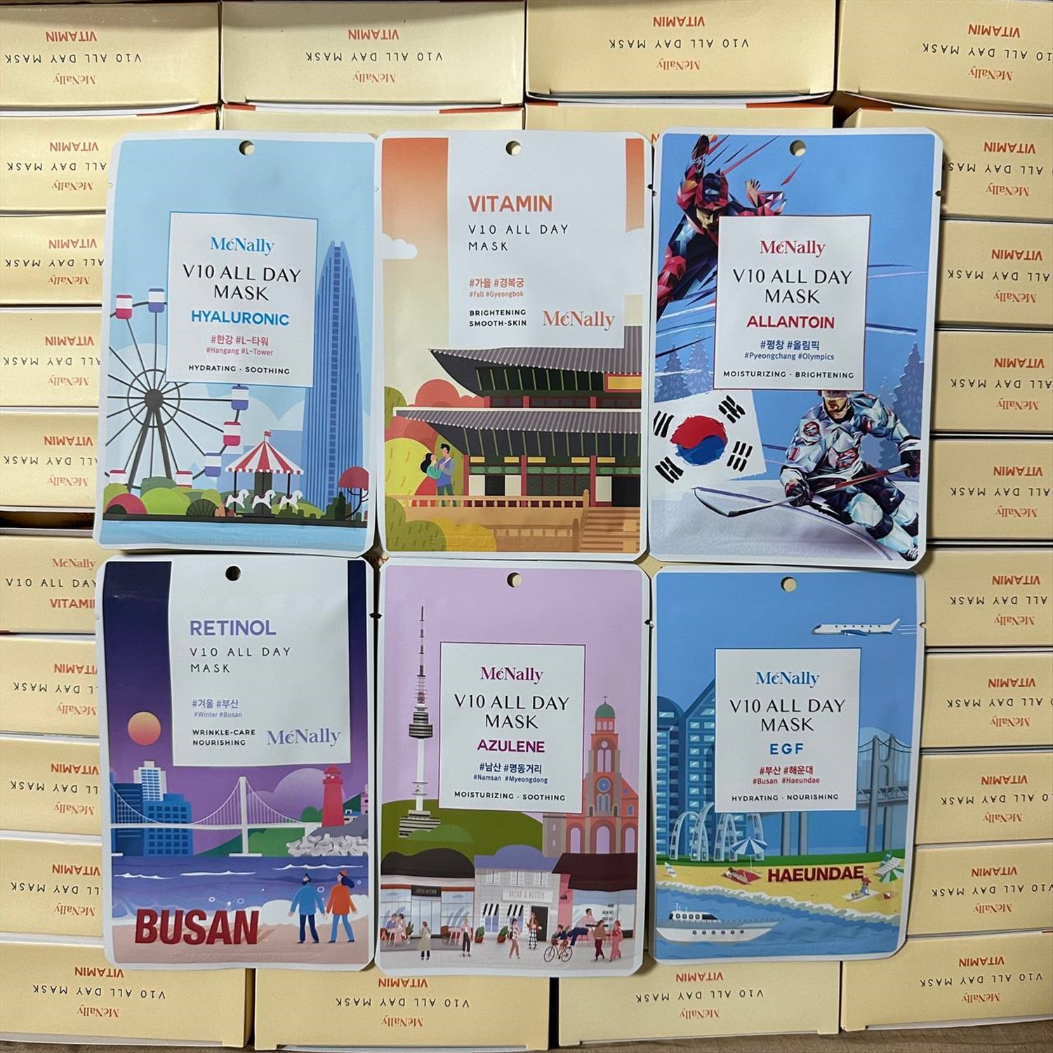 20р 1шт 1. Главный активный компонент маски – гиалуроновая кислота, проникает в самые глубокие слои эпидермиса, активно увлажняет клетки и наполняет кожу энергией. Образует на поверхности защитный слой, который не дает влаге испариться. 2. Эффективная маска для лица с витаминным комплексом для выравнивания тона кожи, уменьшения пигментных пятен и несовершенств. 3. Маска тканевая увлажняющая для сияния кожи с аллантоином выравнивает тон, снимает покраснение и улучшает общий цвет лица, деликатно осветляет пигментацию, борется с сухостью и интенсивно увлажняет. 4. Расслабляющая тканевая маска с ретинолом повышает эластичность и упругость кожи, а также разгладит её. Ретинол в составе увеличивает производство клеток кожи (пролиферацию), что помогает очистить поры от различных загрязнений и избытка кожного сала. 5. Маска тканевая успокаивающая с азуленом направлена на снятие раздражения, покраснения и зуда, смягчает и восстанавливает кожу, выравнивает тон и повышает эластичность. 6. Главный активный компонент маски – полипептид EGF, обладает мощным anti-age эффектом, способствует обновлению клеток эпидермиса, восстанавливает упругость, выравнивает тон кожи и повышает защитные свойства клеток.