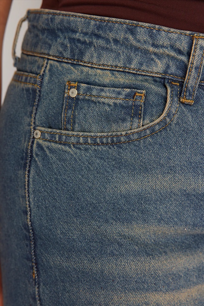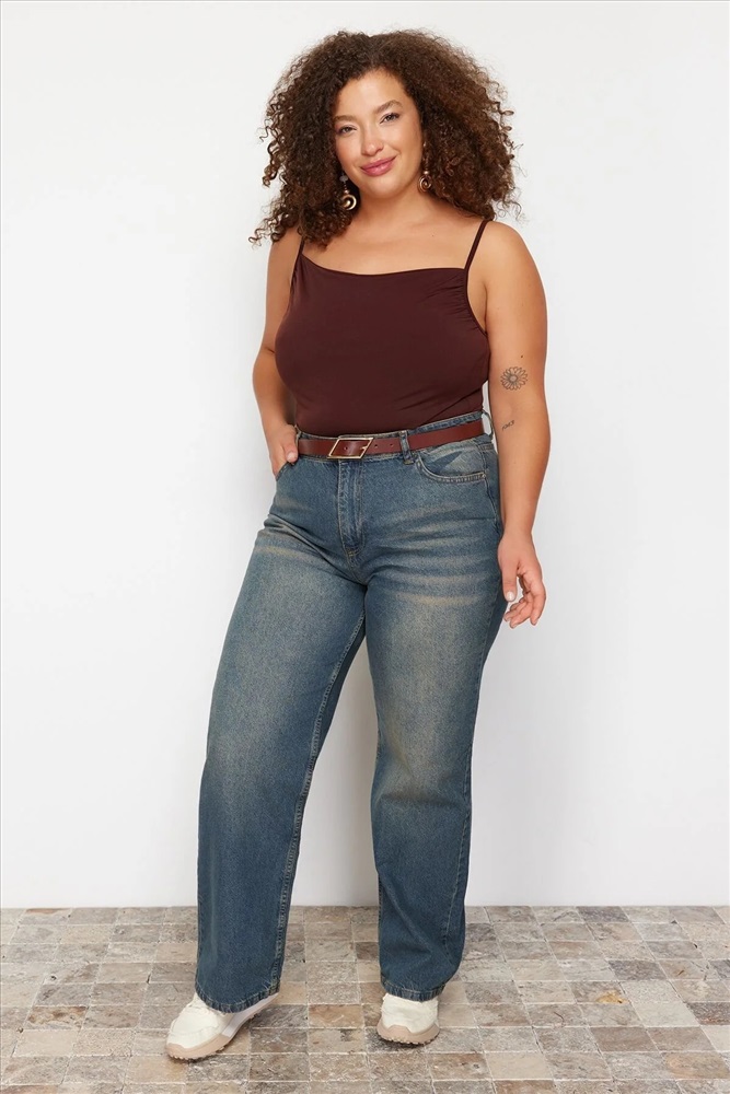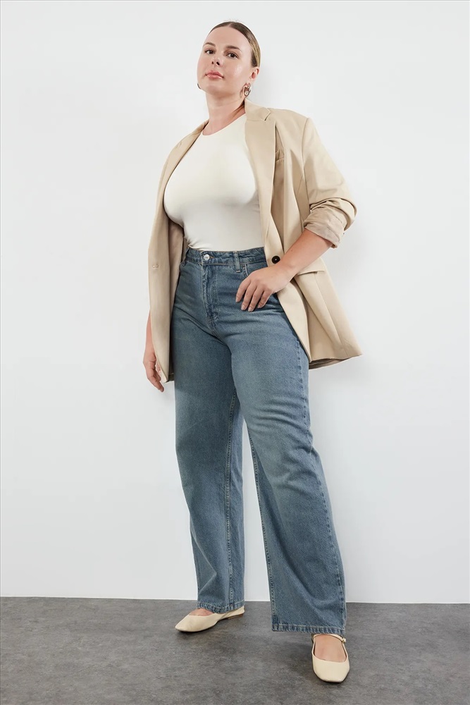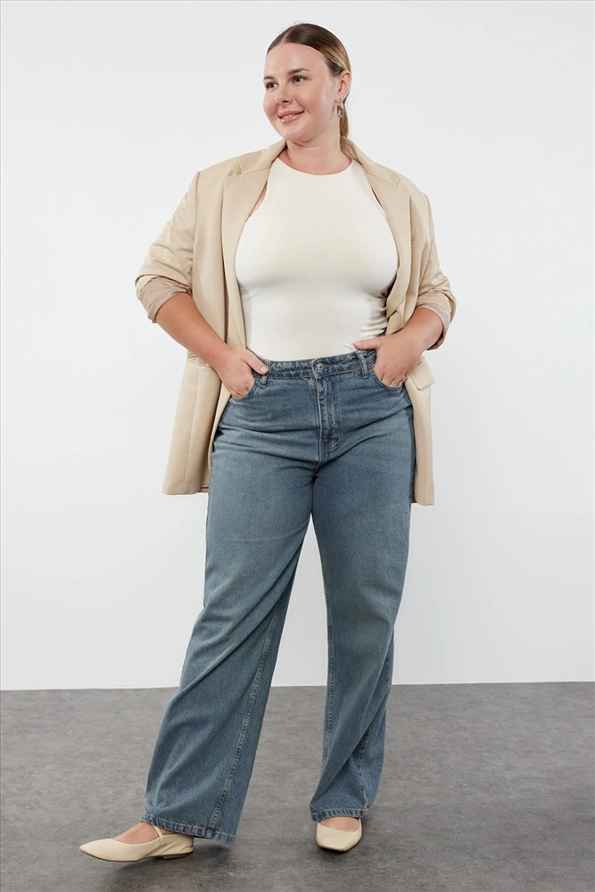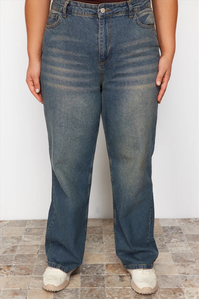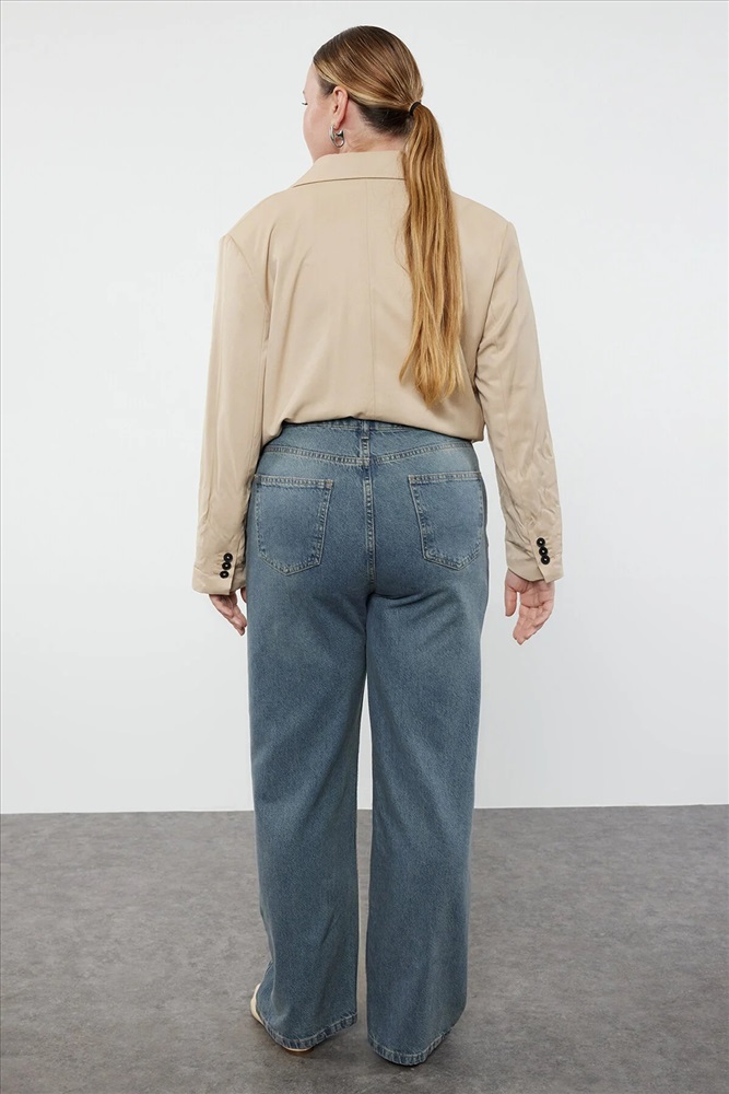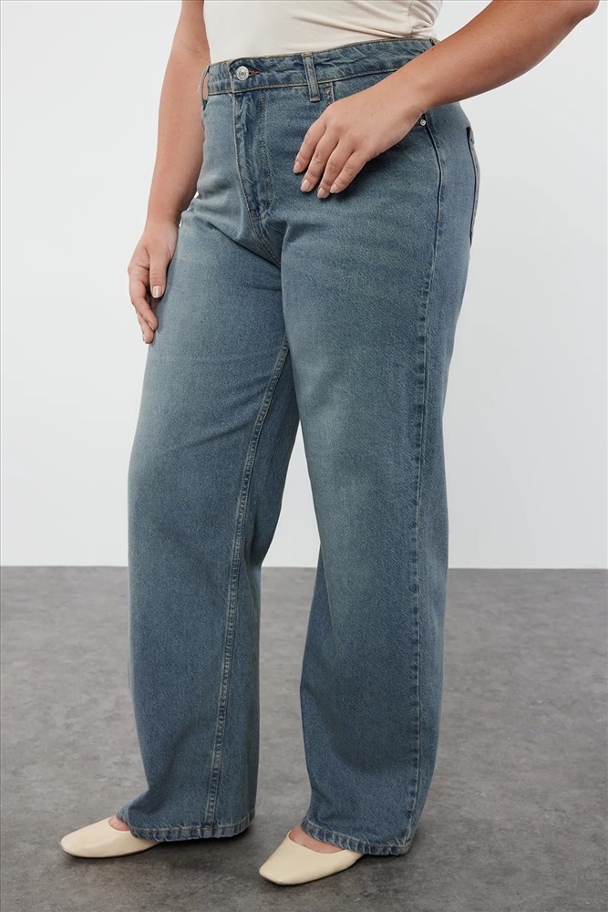 Mavi Yüksek Bel Soluk Efekt Vintage Yıkama Geniş Paça Büyük Beden Wide Leg Jeans TBBSS24CJ00042