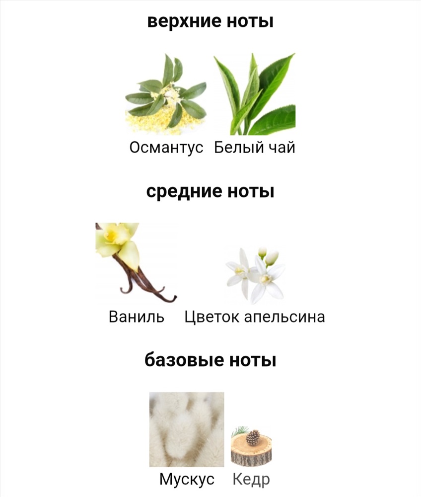 Верхние ноты: Османтус и Белый чай; средние ноты: Ваниль и Цветок апельсина; базовые ноты: Мускус и Кедр.