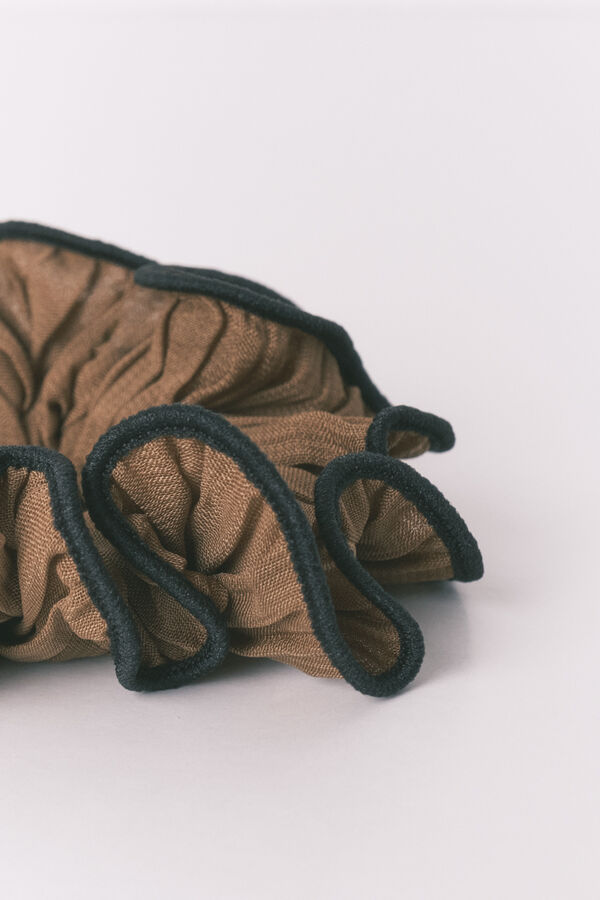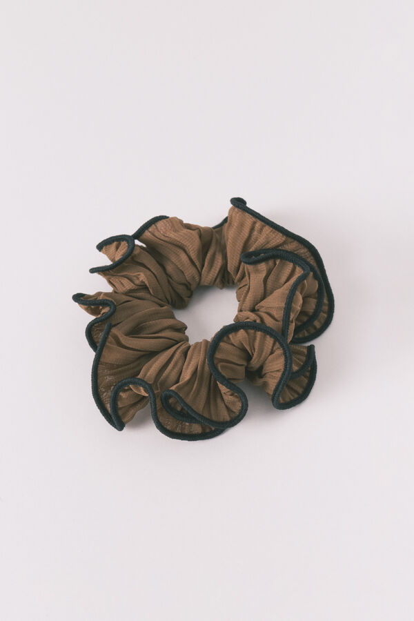 Maxi scrunchie en color marrón con calidad de bambula semi transparente. Ideal para complementar tus looks diarios.