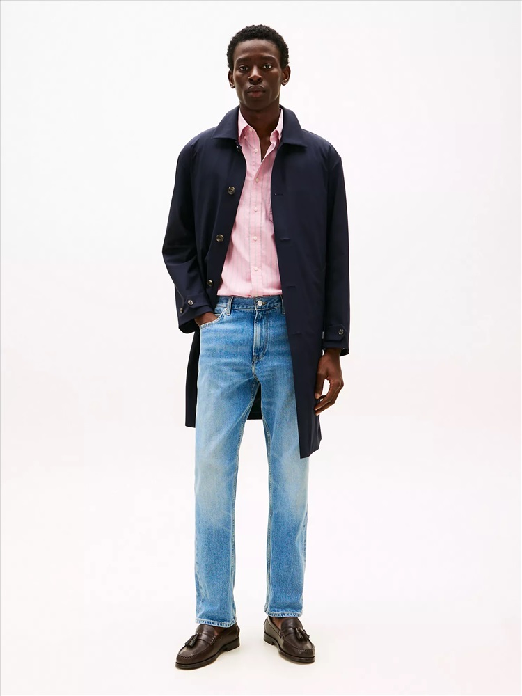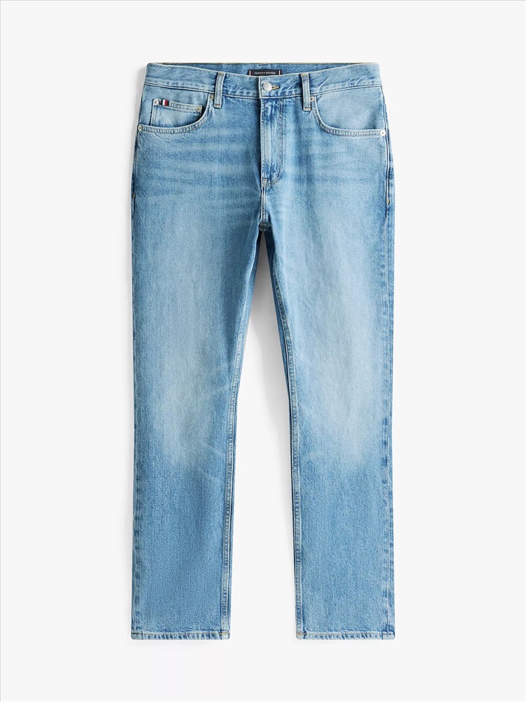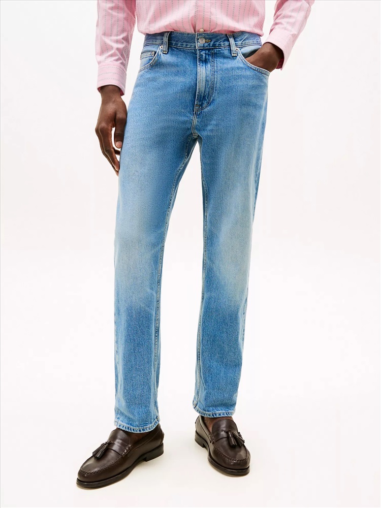 Tommy Hilfiger men's jean. For a timeless look, choose these medium wash, regular-fit jeans designed with subtle fading and just a touch of stretch for comfort.