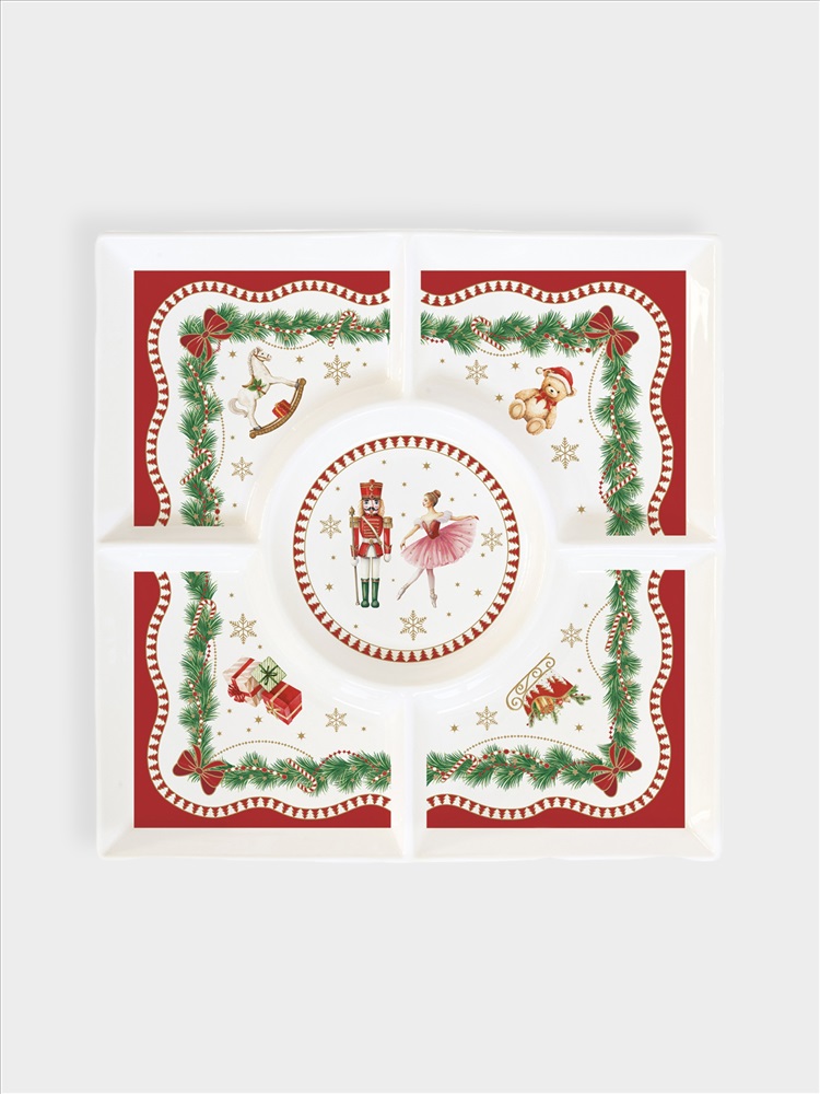 Бренд: EASY LIFE Коллекция: НОВЫЙ ГОД Страна бренда: Китай Менажница, 25 см, 4 отд, фарфор P, белая, Щелкунчик и фея, Magie de Noel. Материал: фарфор Рorcelain. Мыть тёплой водой с применением ЖМС. Не использовать в СВЧ и посудомоечной машине.