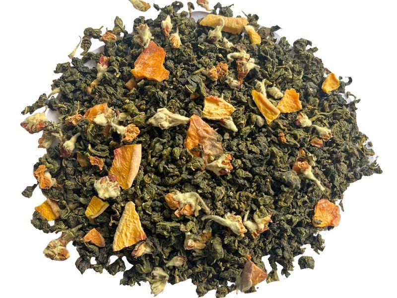 Купаж улуна высшего сорта, кусочков персика и цветов персикового дерева. С нежным молочно-персиковым ароматом.