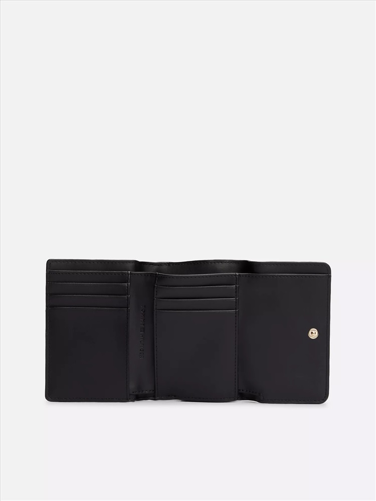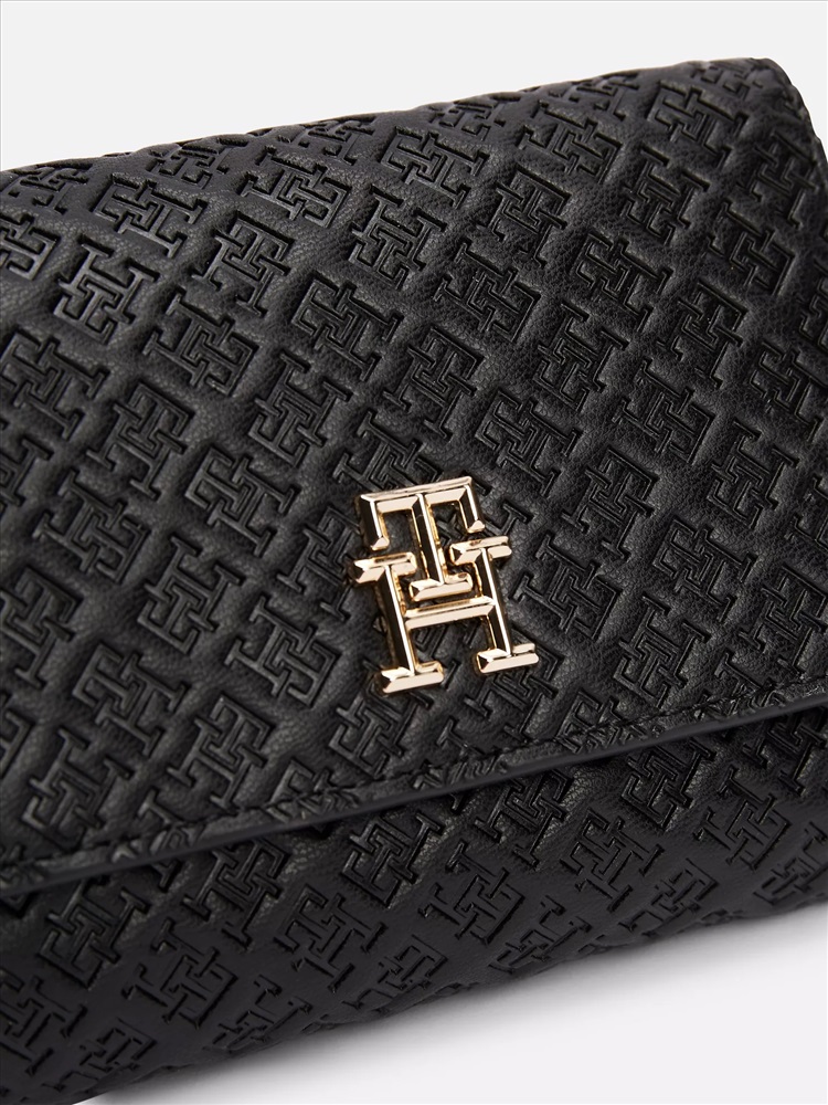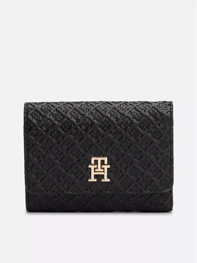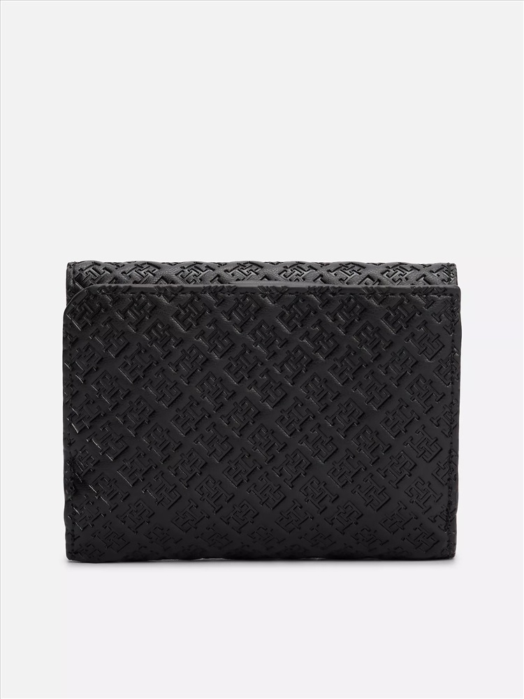Tommy Hilfiger women's wallet. Show a little brand love with this sleek wallet, featuring an allover Monogram embossment. With its tri-fold design and snap closure, it opens up to reveal plenty of room for your cards and currency.