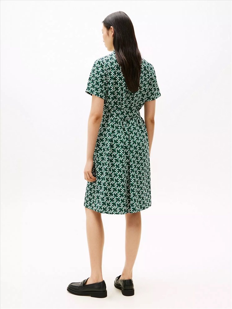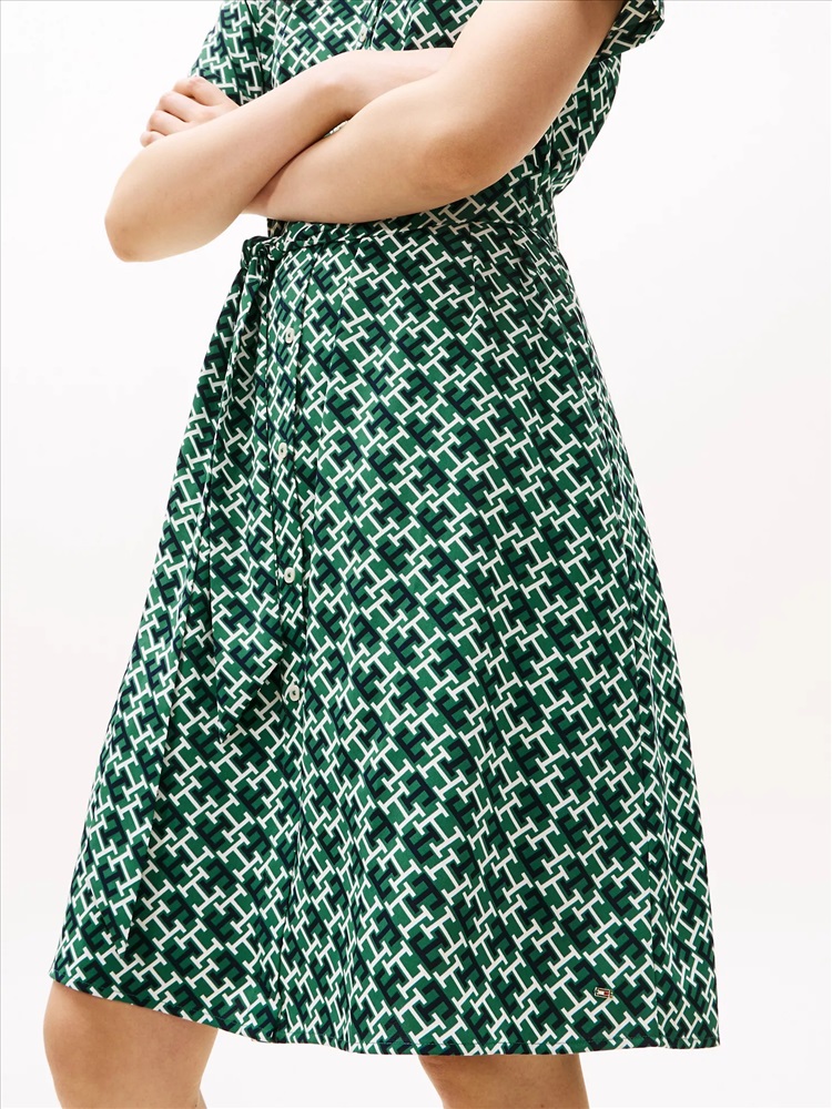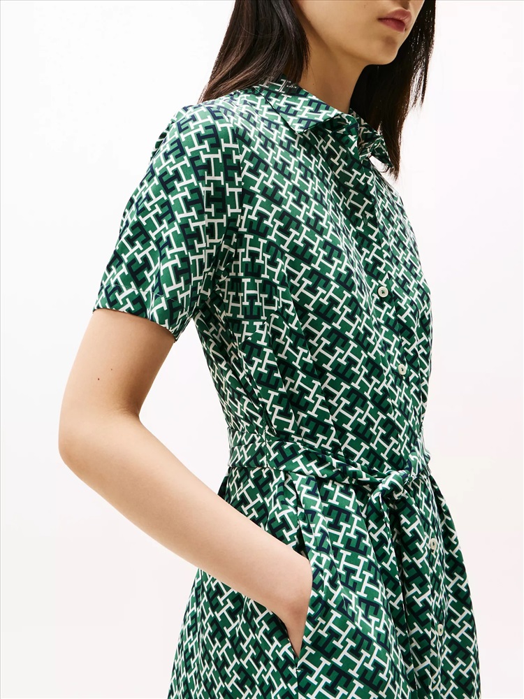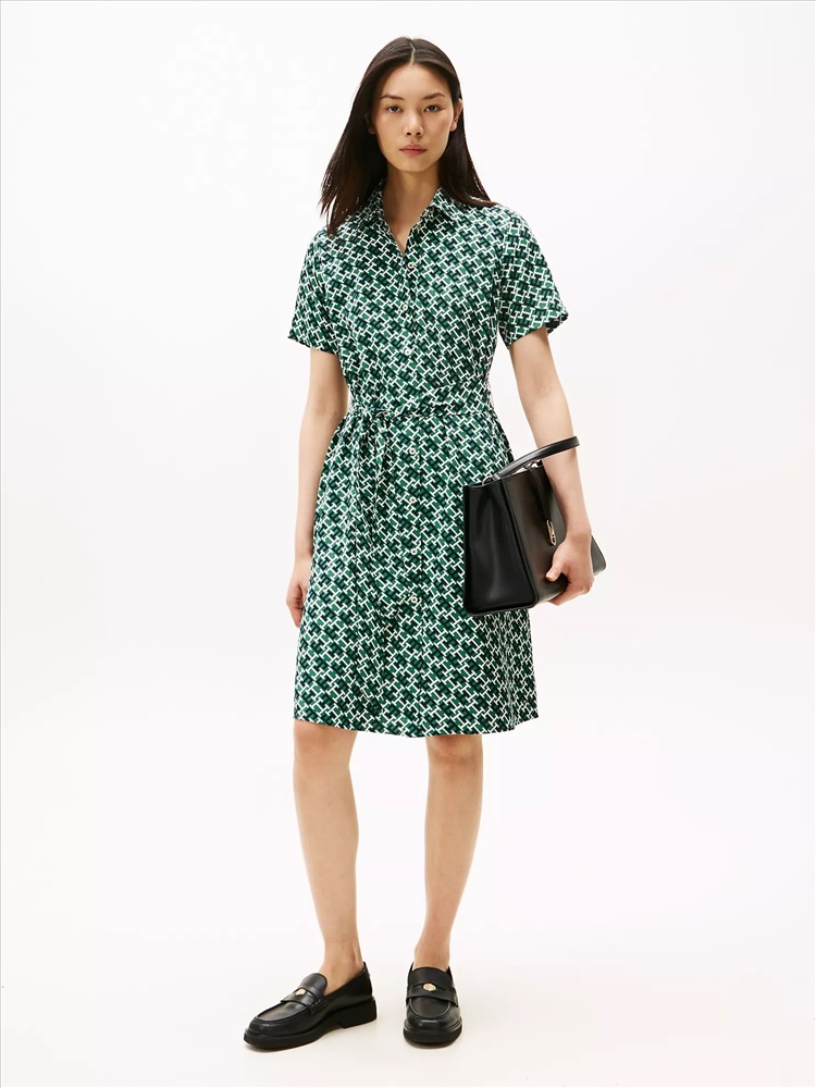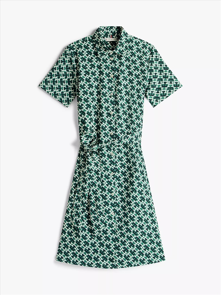 Tommy Hilfiger women's dress. Show a little brand love with our monogram-print shirt dress. Made from fluid crepe, this flattering silhouette is accented by a self-tie waist belt, allowing for a personalized fit.
