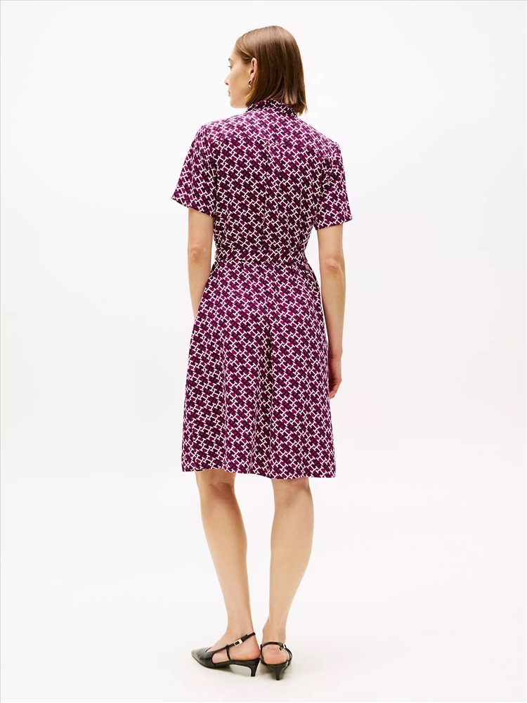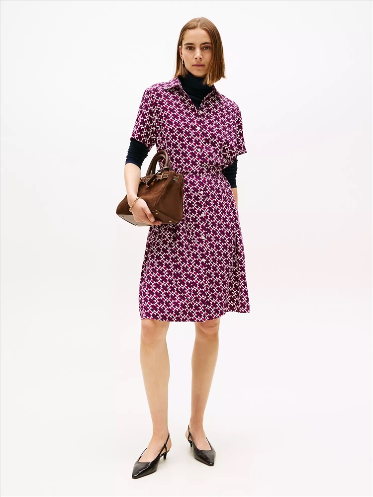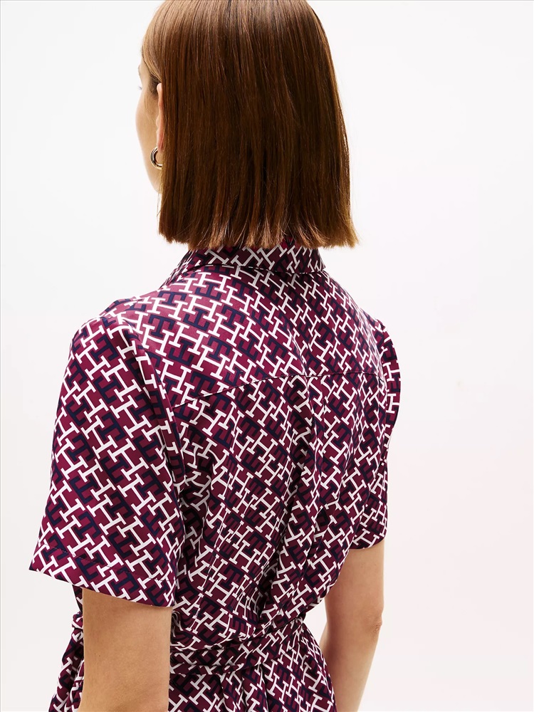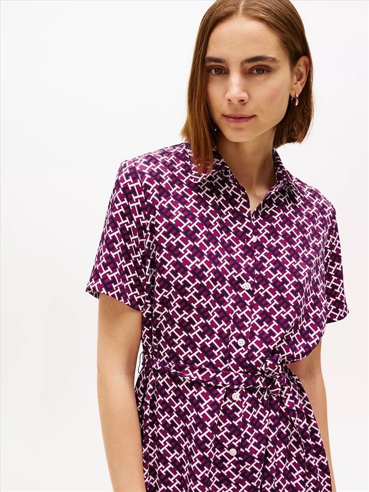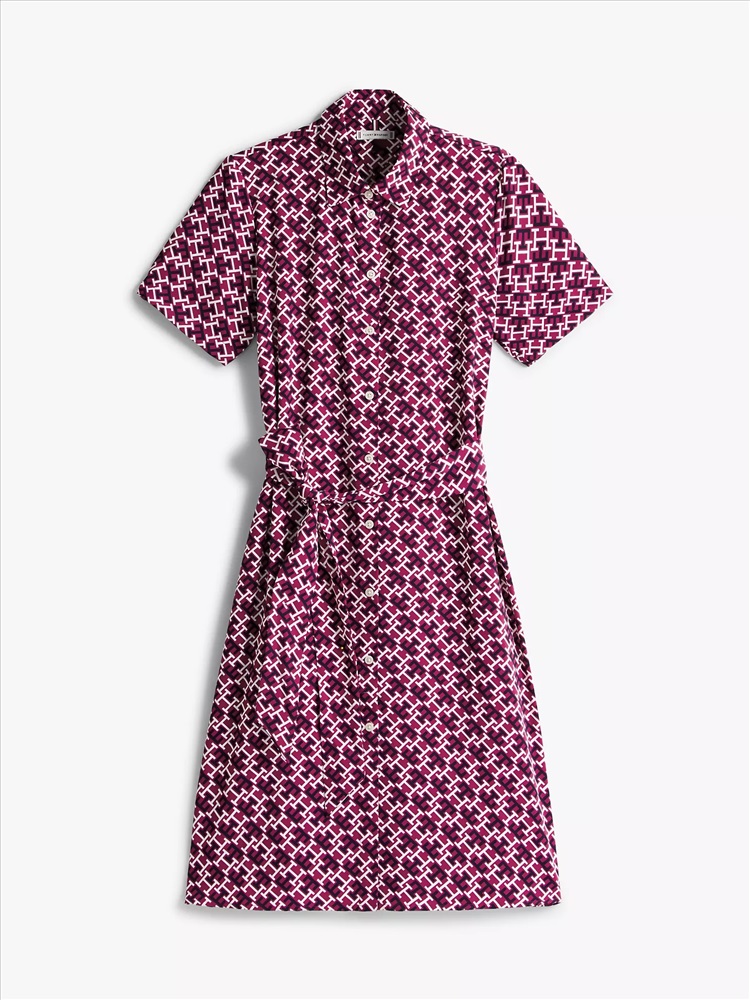Tommy Hilfiger women's dress. Show a little brand love with our monogram-print shirt dress. Made from fluid crepe, this flattering silhouette is accented by a self-tie waist belt, allowing for a personalized fit.