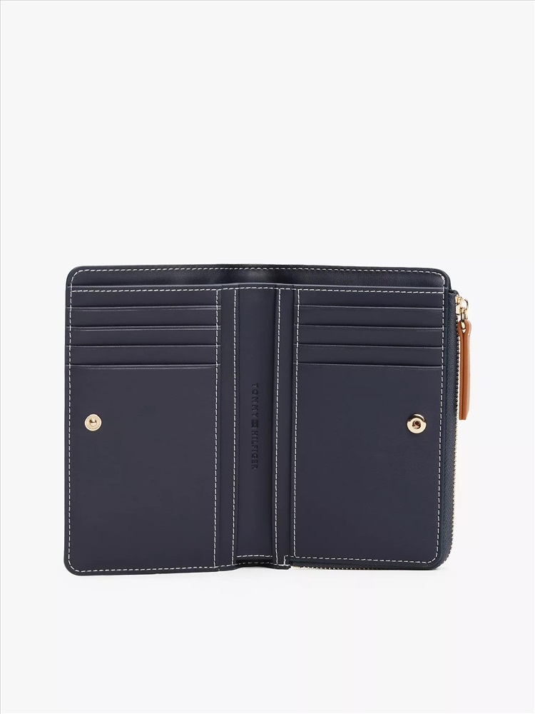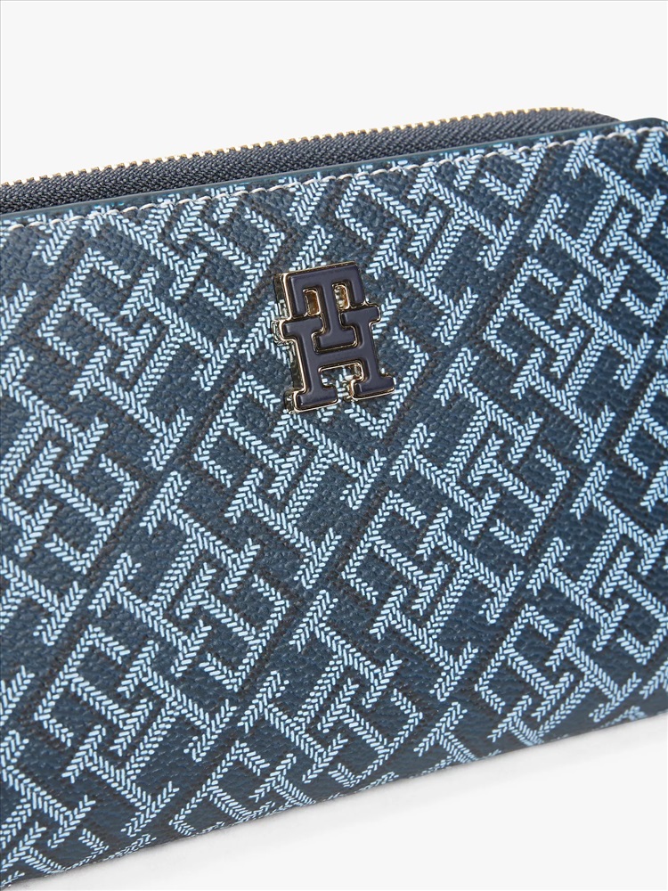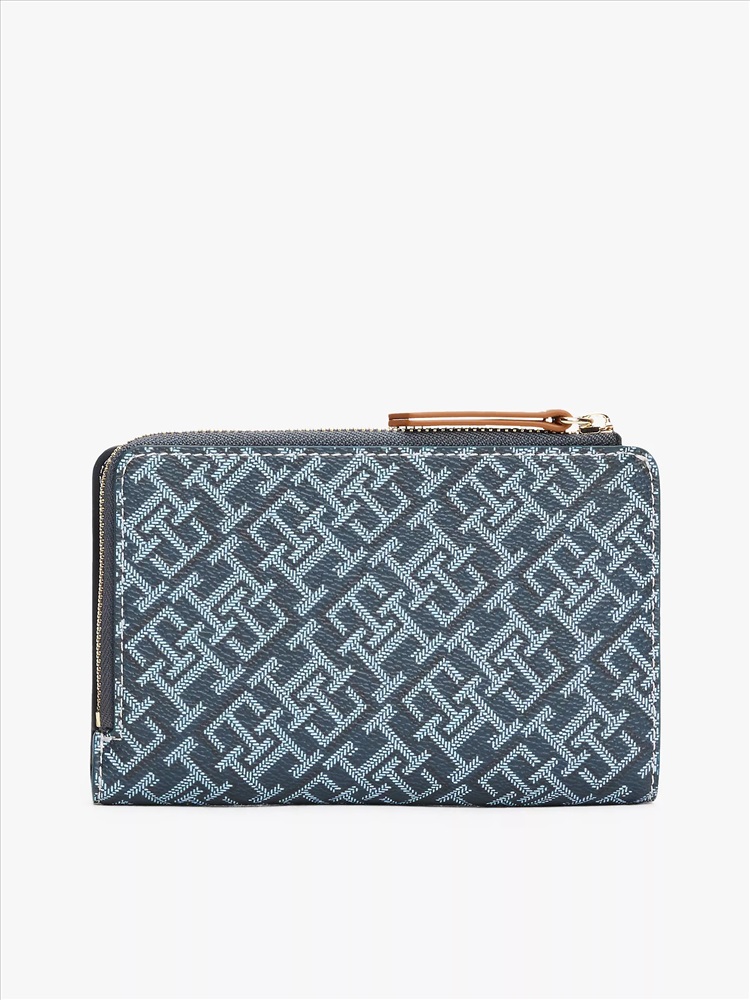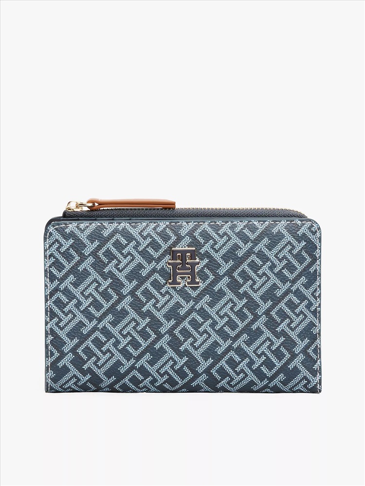 Tommy Hilfiger women's wallet. This wallet elevates your accessory game, thanks to the textured, allover monogram design. This compact bifold features a snap closure, multiple card slots, and a separate zip compartment.