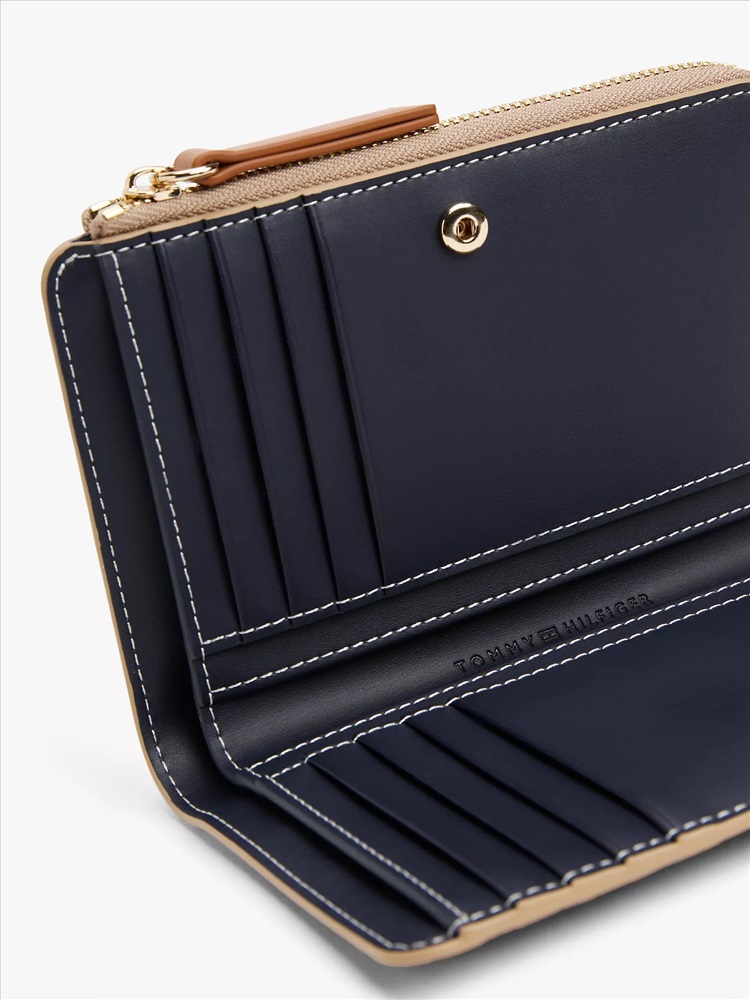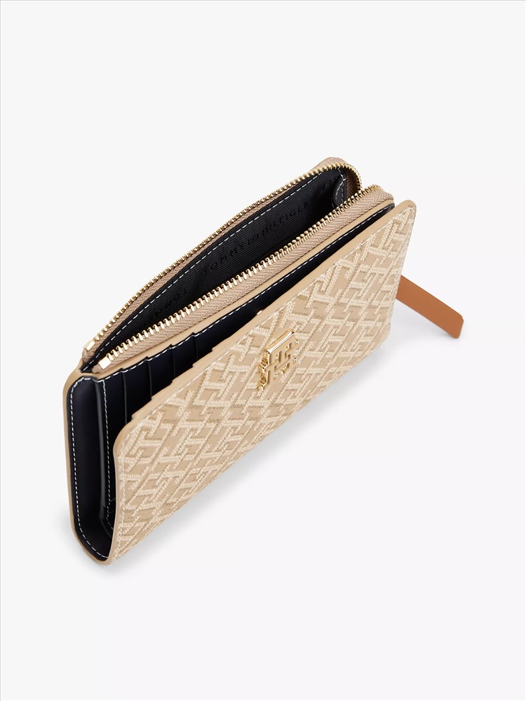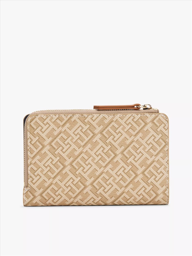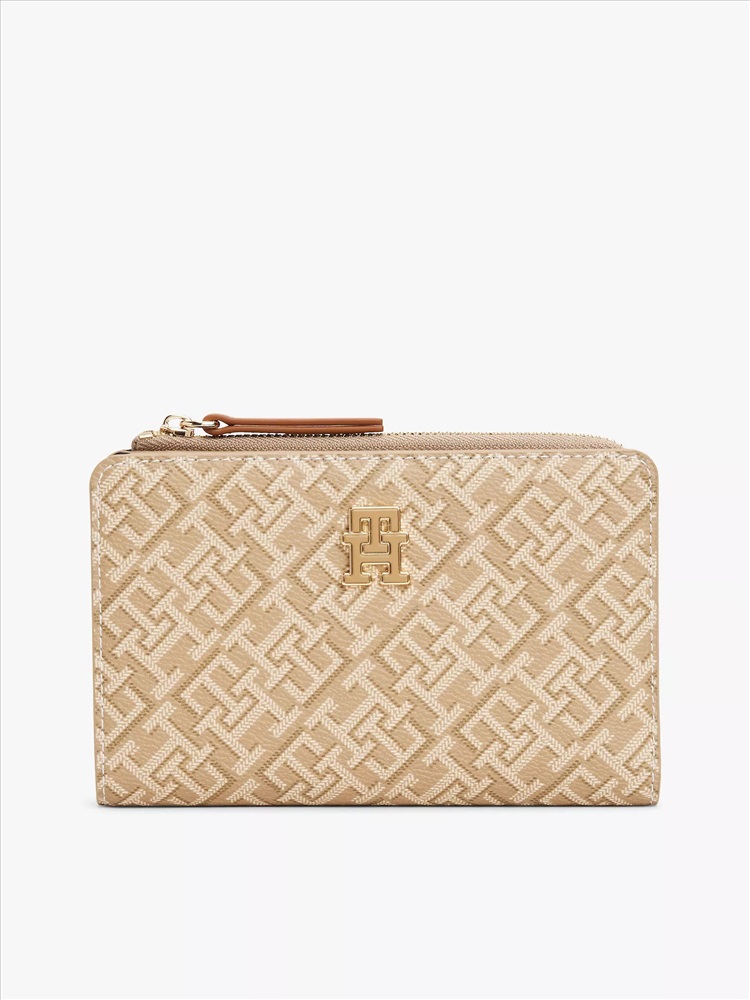 Tommy Hilfiger women's wallet. This wallet elevates your accessory game, thanks to the textured, allover monogram design. This compact bifold features a snap closure, multiple card slots, and a separate zip compartment.