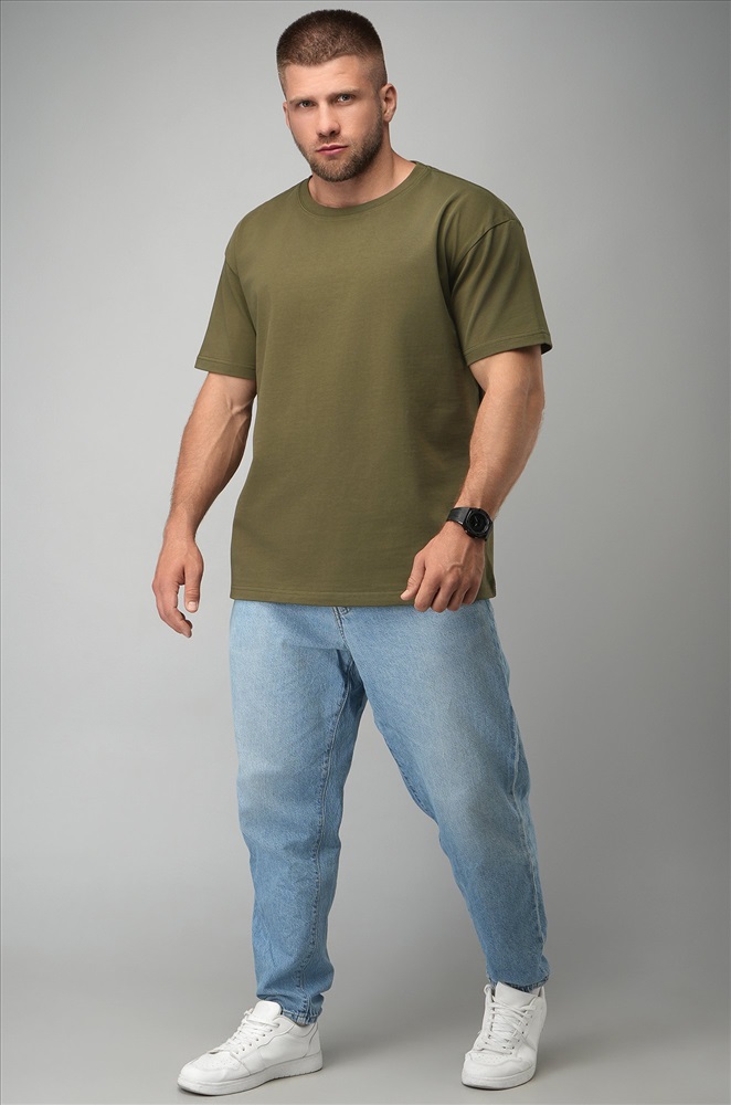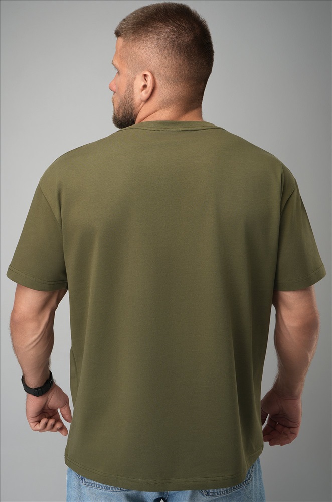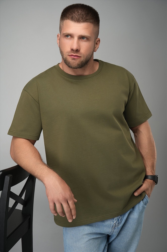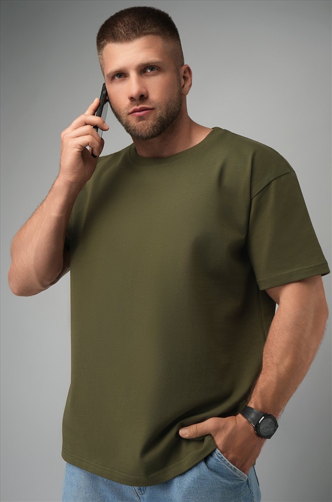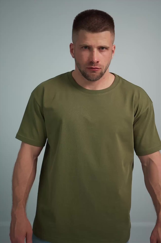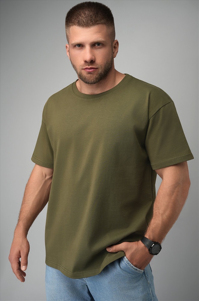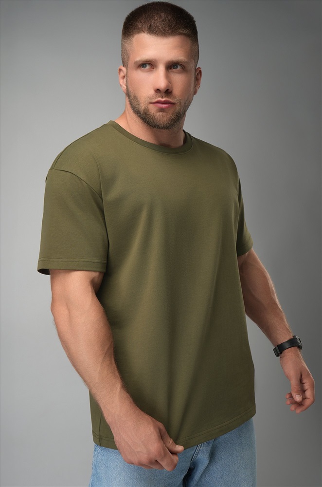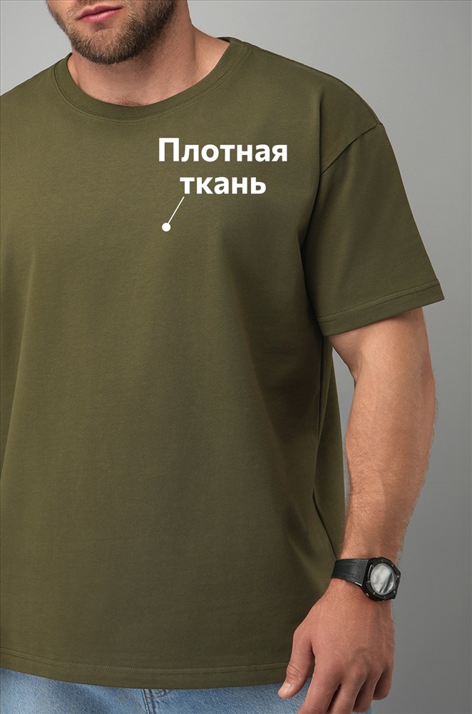 Базовая мужская футболка цвета хаки — универсальный элемент твоего образа. Плотная хлопковая футболка — максимум удобства в течение дня.