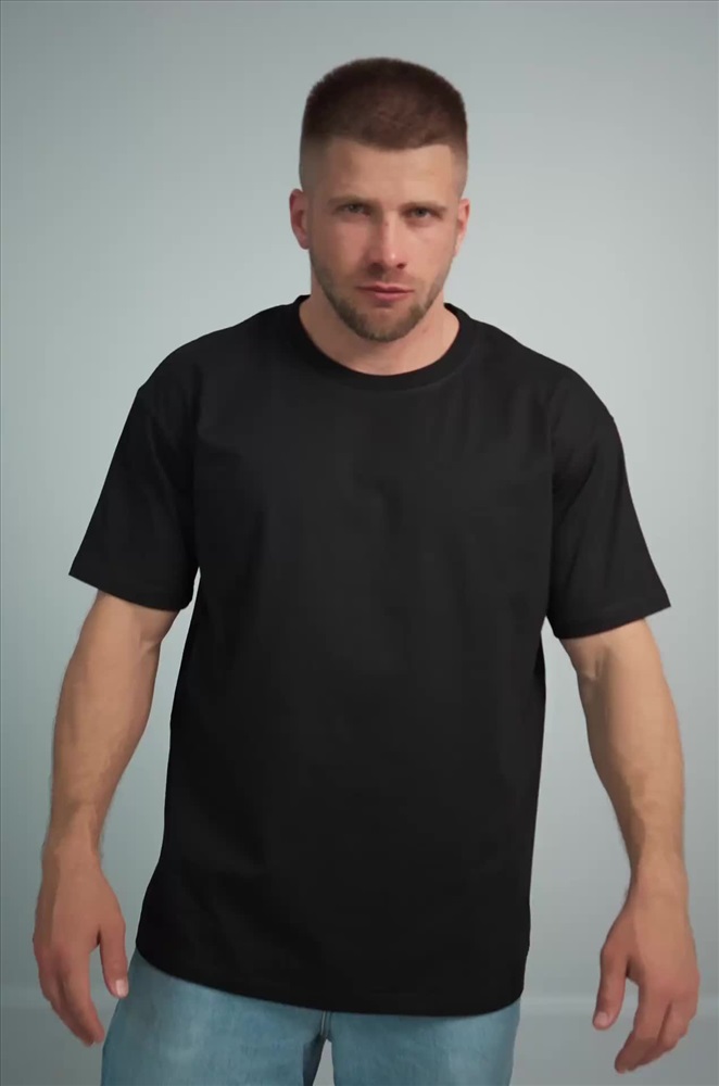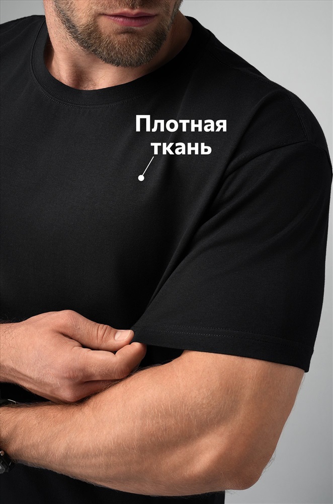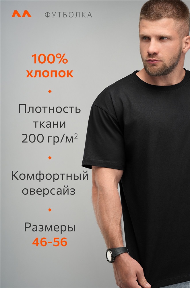 Преимущества: – 100% хлопковый трикотаж высокой плотности (200 г/м2); – однотонная основа легко сочетается с любыми цветами; – подходит для лета и других сезонов; – приятная на ощупь трикотажная структура; – универсальный вариант для мужчин. Черная футболка прямого кроя со слегка спущенным плечом и классической круглой горловиной. Отличный вариант на работу, повседневные прогулки и для дома. Модель Артем, его рост 172 см, параметры 111-87-98 см. На нем размер 50.