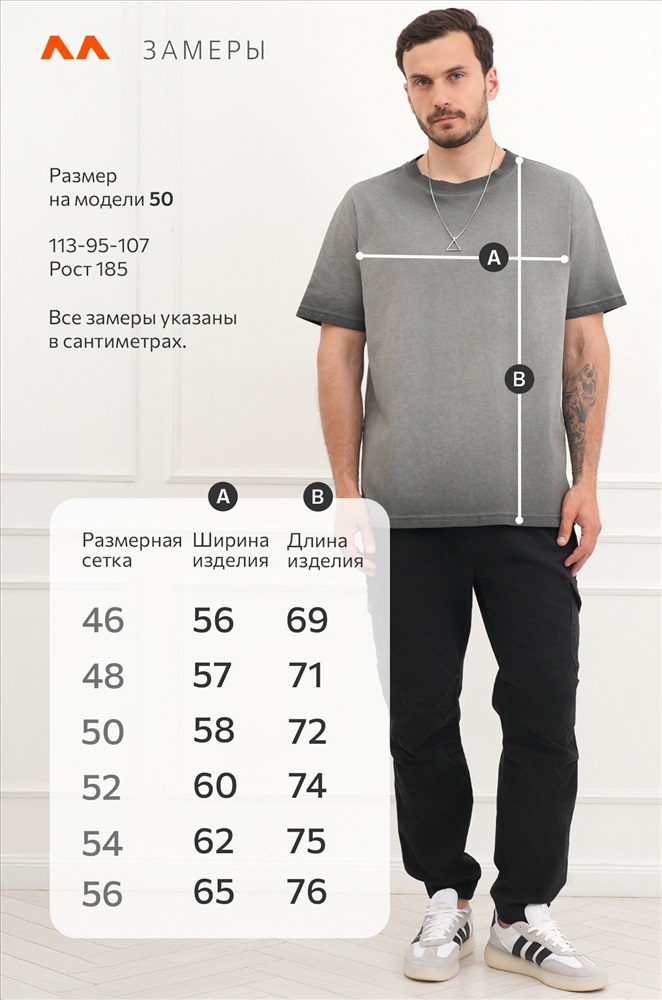 Рост модели 185 см, параметры: объем груди 113, объем талии 95, объем бедер 107. На нем размер 50.