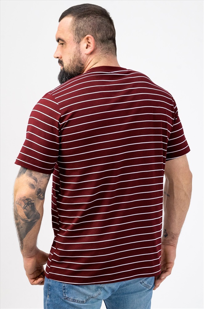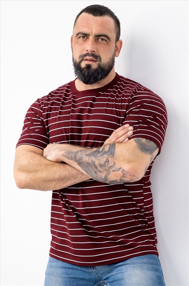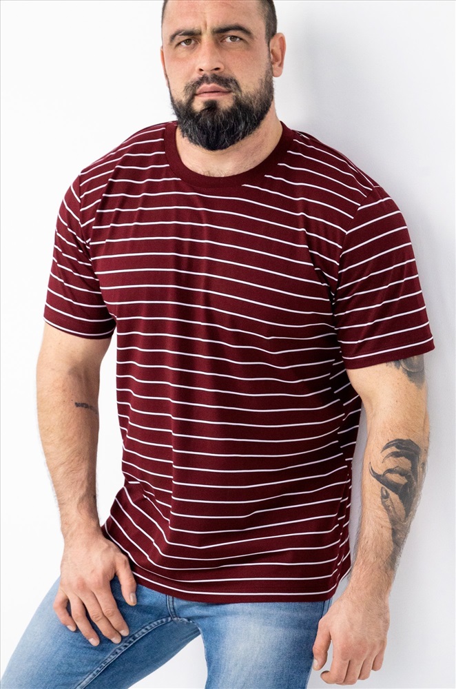 Полосатая мужская футболка в приятной бордовой гамме – отличный базовый вариант. Мягкий трикотаж супрем с высоким содержанием хлопка приятный на ощупь и хорошо держит форму.