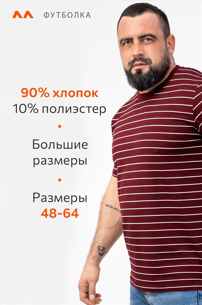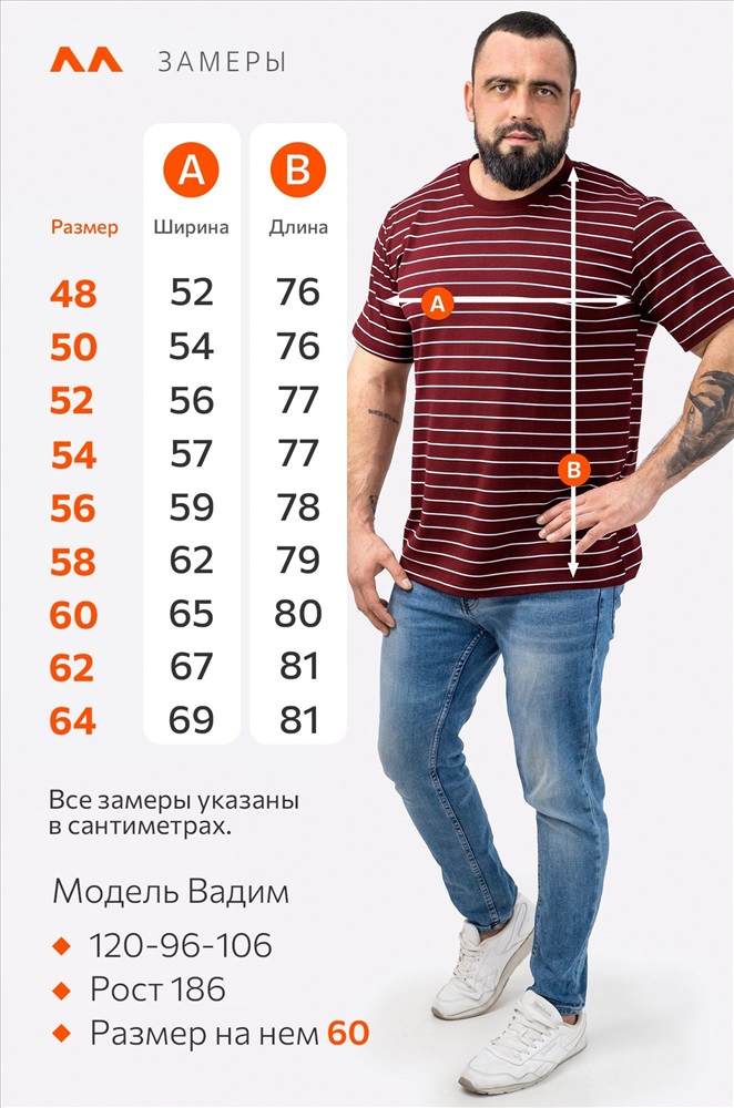 Рост модели 186 см, параметры 120-96-106 см. На нем футболка 60 размера.