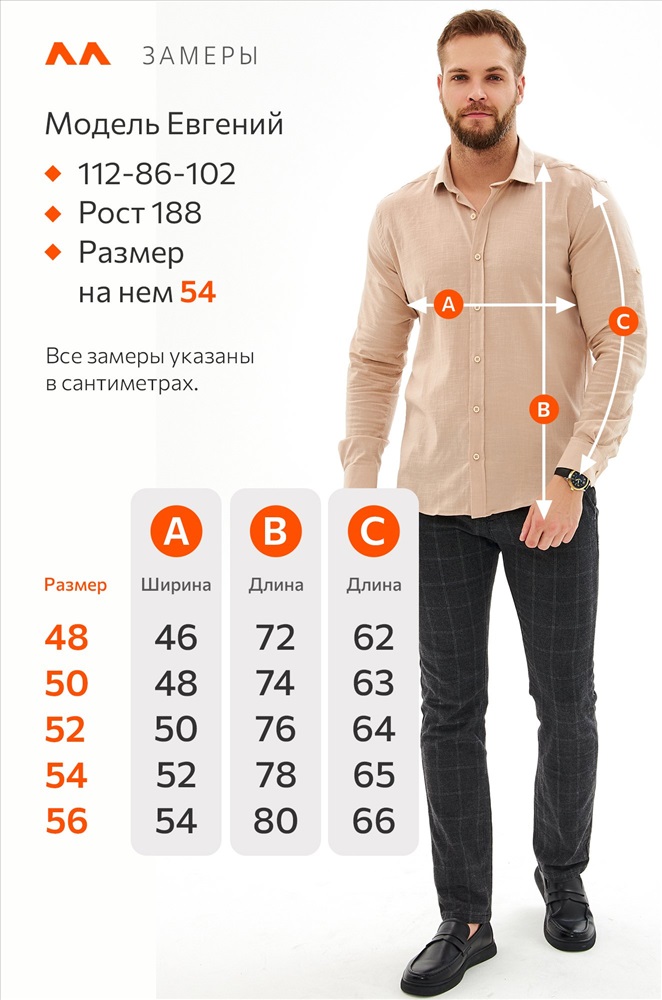 Рост модели 188 см, параметры: объем груди 112, объем талии 86, объем бедер 102 см. На нем размер 54.