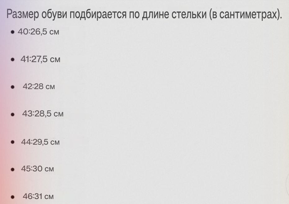 Размер: 40 25,5см, 41 26см, 42 26,5см, 43 27см, 44 27,5см, 45 28см
