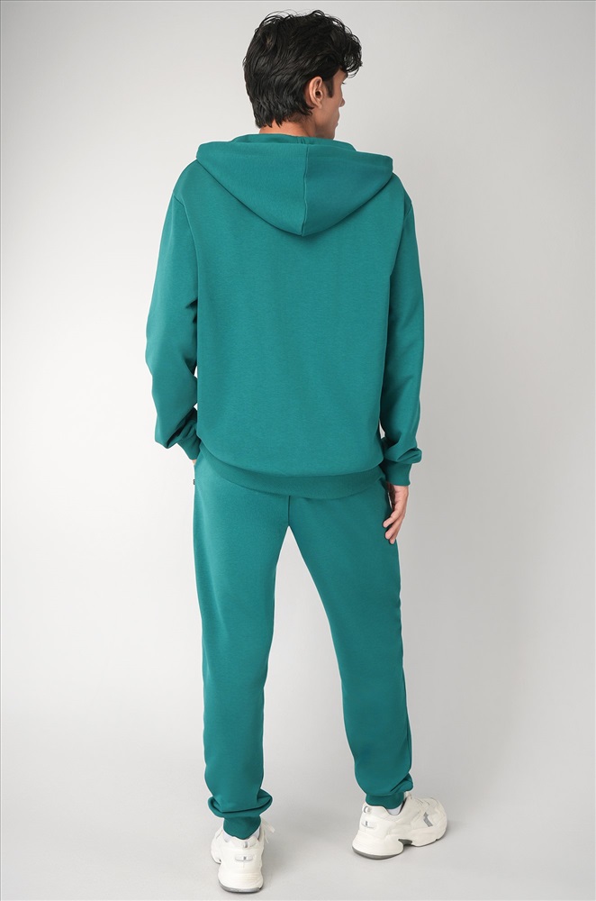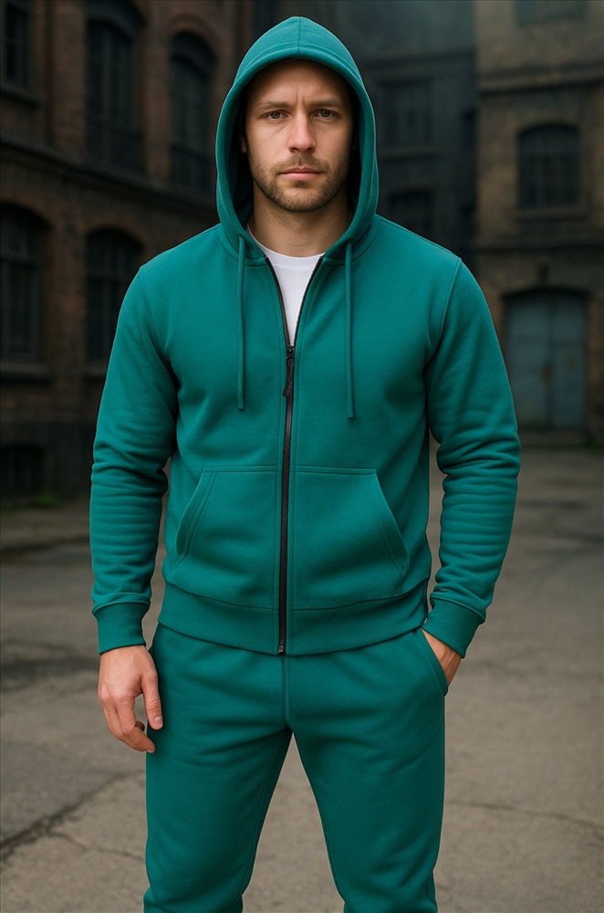 — однотонный зеленый костюм со штанами выполнен из плотного футера трехнитки;