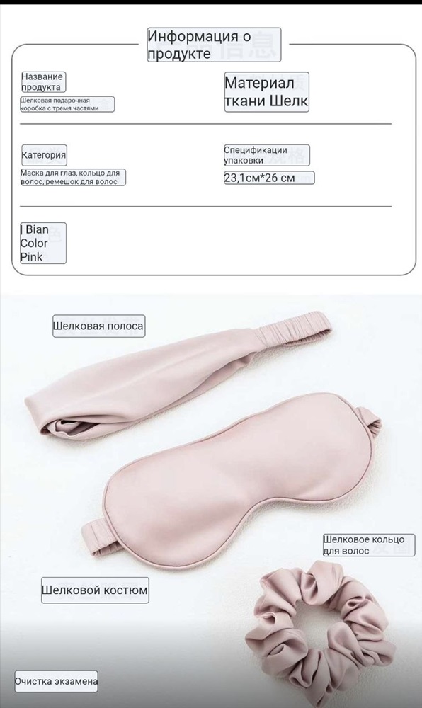 Материал:шелк тутового шелкопряда В комплекте: шелковая резинка для волос, шелковая повязка для волос, шелковая маска для глаз Комментарии к товару