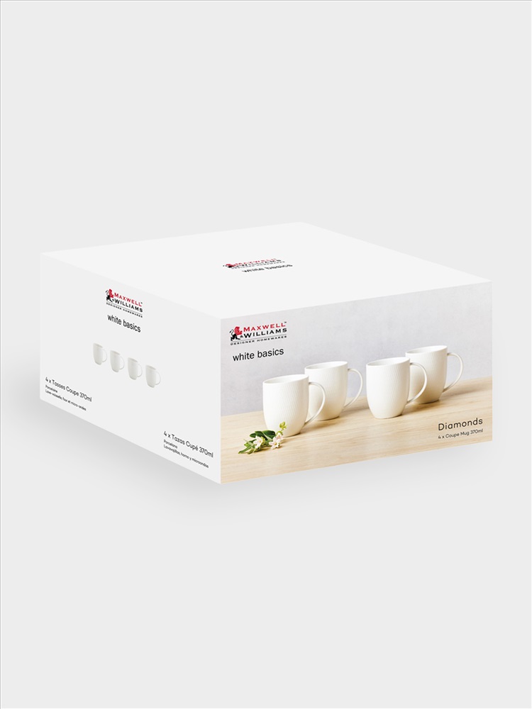 Бренд: MAXWELL & WILLIAMS Коллекция: БАЗОВАЯ Страна бренда: Китай Кружка, 4 шт, 370 мл, фарфор P, белая, Diamonds. Материал: фарфор Рorcelain. Мыть тёплой водой с применением жидких моющих средств и в посудомоечной машине. Можно использовать в СВЧ.