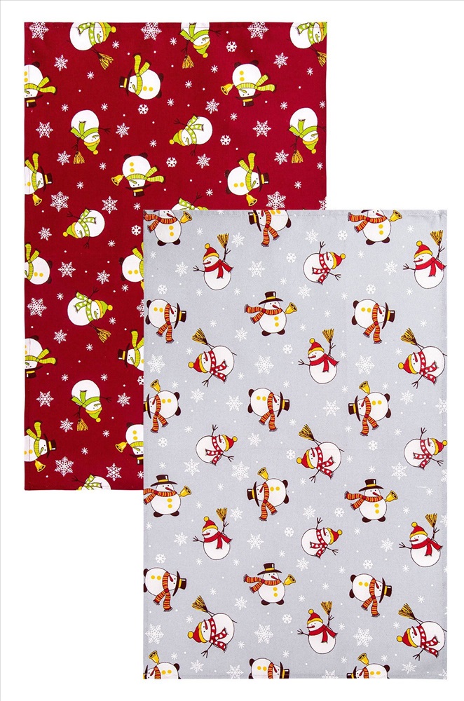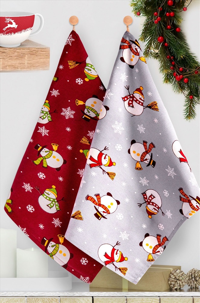 Новогодний комплект кухонных полотенец с петельками выполнен из рогожки – натурального 100% хлопка. В наборе представлены два полотенца с рисунком Снеговики на тематику зимних праздников. Полотенца выполнены в сером и красном цветах.