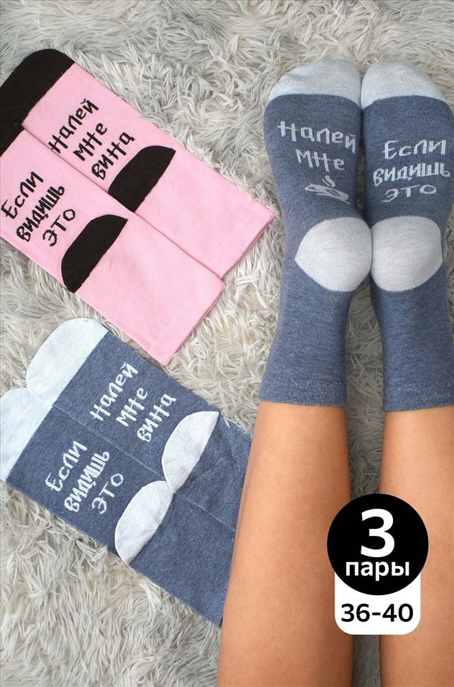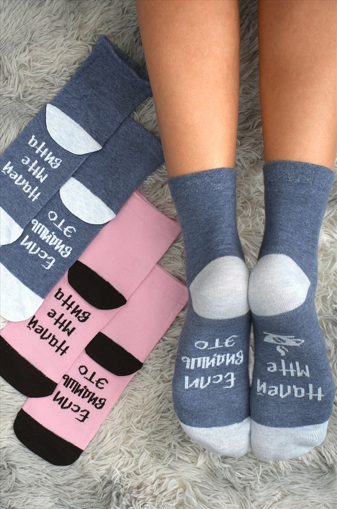 Набор женских носков с прикольными надписями на стопах – это готовый комплект на каждый день, милый практичный подарок и еще – отличное настроение! В наборе 3 пары носков базовых цветов.