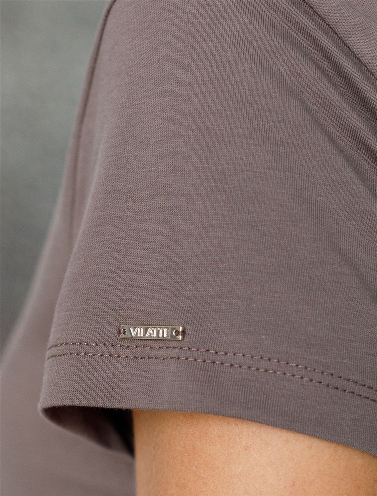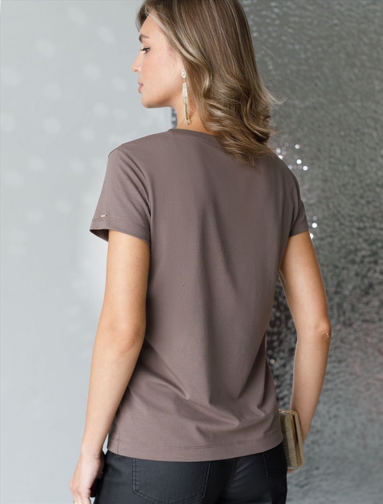 Стильная базовая футболка кофейного цвета с серебристым принтом фольгой выполнена из плотного хлопка с эластаном для комфортной посадки на любую фигуру. Прямая футболка классического кроя с круглым вырезом, прекрасно подходит для разных типов фигуры, в том числе и на большие размеры. Мягкость хлопка вместе с небольшой долей эластана гарантирует идеальную посадку и свободу движений. Легкая натуральная дышащая ткань премиального качества делает футболку с коротким рукавом идеальным вариантом для повседневной носки дома, на работу или офис. Однотонная футболка дополнена авторским аккуратным принтом с изображением леопарда, который придает праздничный и элегантный вид без лишней вычурности. Блестящий анималистичный принт аккуратно украшает, добавляя изысканный акцент и создавая легкий мерцающий эффект.